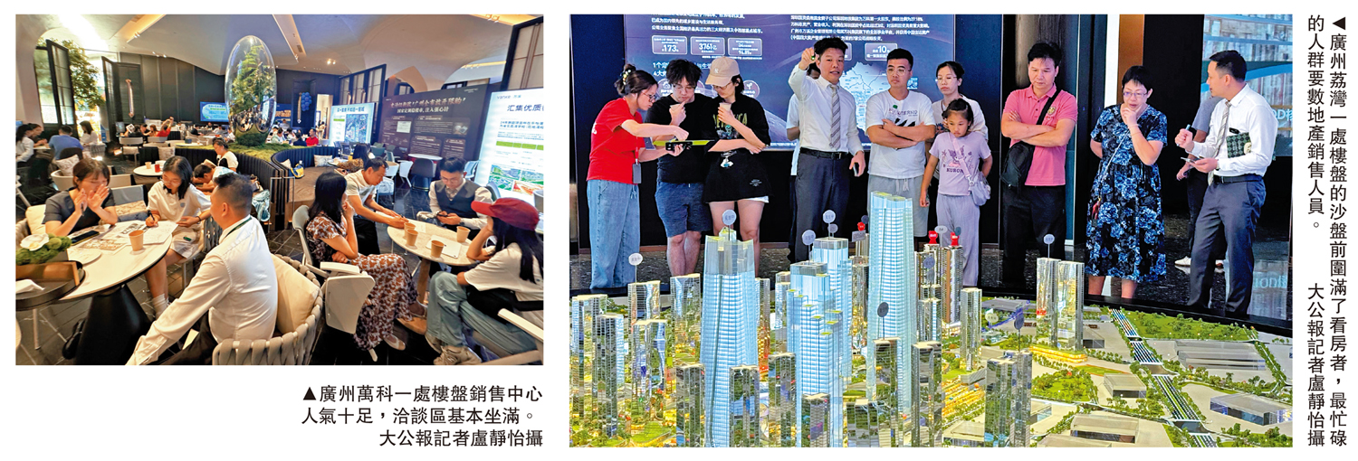 廣州番禺的新世界廣場耀勝尊府,銷售中心十分火爆。銷售人員說國慶前兩天,手機一早已是響個不停。他說:「大部分觀望的舊客都在諮詢之前心儀房源,以及現行購房政策的優惠力度,有多枱舊客直接聯繫銷售現場看房。」該樓盤目前有近兩成為外籍及港澳客戶,不少香港客戶覺得以500多萬元(人民幣,下同)總價入手「千呎豪宅」,很有性價比。
