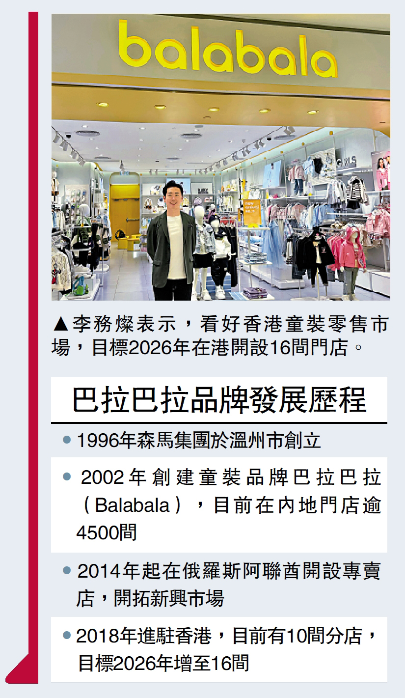【大公報訊】森馬集團童裝品牌巴拉巴拉(Balabala)計劃今年11月在灣仔及將軍澳增開兩家分店,令本港分店增至12間。森馬國際集團(香港)公司總經理李務燦透露,巴拉巴拉海港城店目前是全球坪效(商店單位面積下的平均營業額)最高的門店。訪港旅客增加及國際人才來港,巴拉巴拉銅鑼灣店及將軍澳店營業額均上升,集團持續看好本港童裝零售市場,期望2026年前在港再開4間門店。另外,集團期望能發揮香港國際化的優勢,將本港的商業模式延用至其他市場。