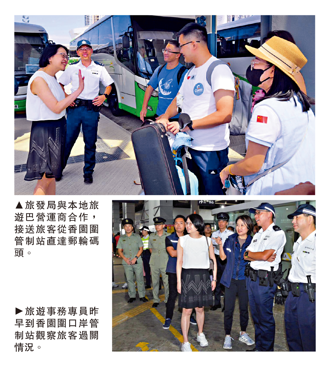 旅遊事務專員張馮泳萍昨日到香園圍管制站視察旅客過關情況,見到參與郵輪人士不乏家庭旅客,他們表示前往香港登船體驗良好並十分方便。