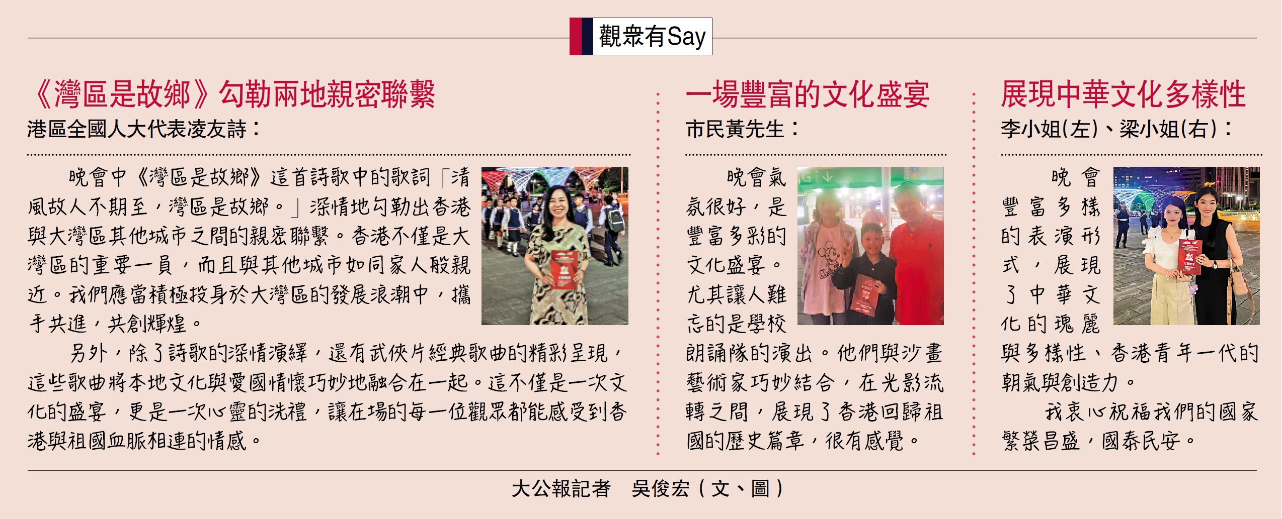 晚會中《灣區是故鄉》這首詩歌中的歌詞「清風故人不期至,灣區是故鄉。」深情地勾勒出香港與大灣區其他城市之間的親密聯繫。香港不僅是大灣區的重要一員,而且與其他城市如同家人般親近。我們應當積極投身於大灣區的發展浪潮中,攜手共進,共創輝煌。