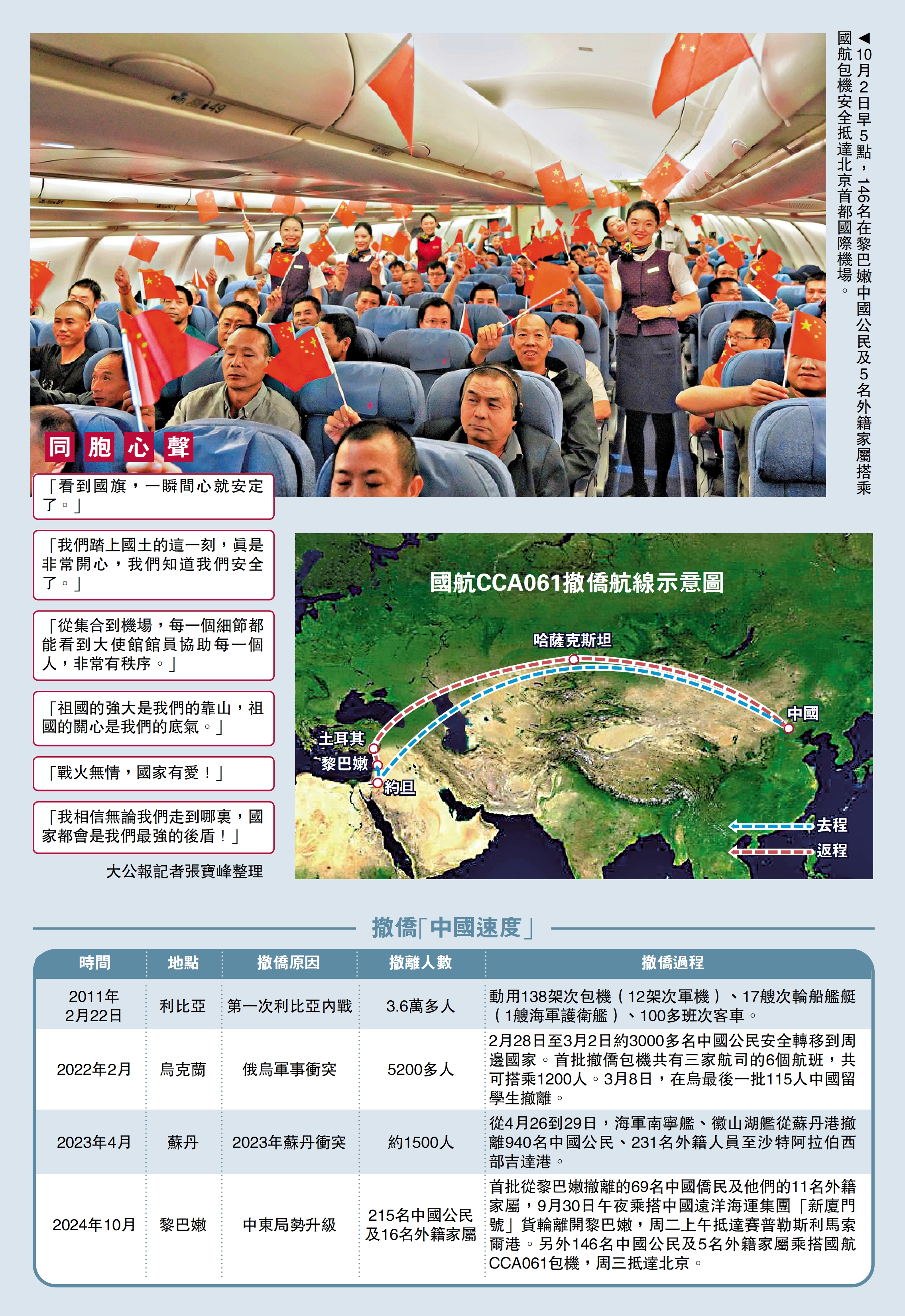 目前,有撤離意願的中國公民均已安全撤離黎巴嫩,中國駐黎巴嫩使館亦將繼續堅守崗位開展工作。安全歸國的僑民們紛紛表示:「祖國的強大是我們的靠山,祖國的關心是我們的底氣。」/大公報記者 張寶峰、馬靜