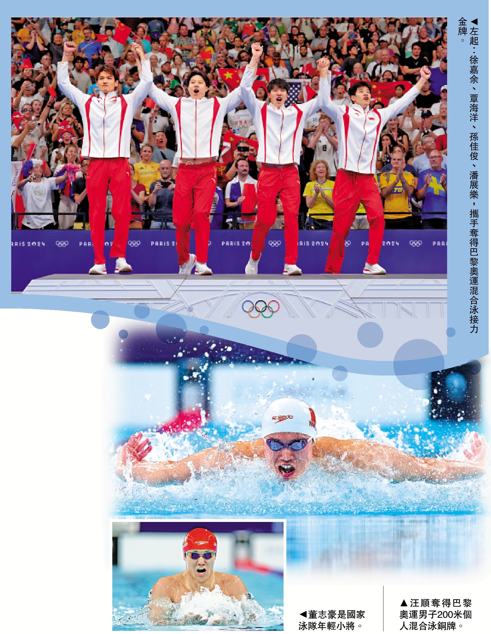 巴黎奧運周期中,中國男子游泳隊湧現出潘展樂、覃海洋、董志豪、張展碩、王浩宇、季新傑等多位世界冠軍,迎來了屬於自己的黃金時代。巴黎奧運上,中國男子游泳隊勇奪男子4×100米混合泳接力金牌,打破了美國游泳隊對該項目長達40年的壟斷。更令人欣喜的是,一大批年輕精英已經從內地賽場走向世界大賽舞台中央,讓國人對中國男子游泳的未來充滿了希望。