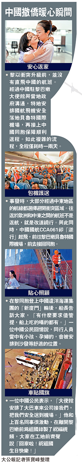 •在黎同胞登上中國遠洋海運集團的「新廈門」輪後,船長告訴大家,「有什麼要求儘管提,船上吃的喝的都有。」一位中國公民回憶說,同行人員當中有小孩、孕婦的,會被安排到沙發等舒適的位置。