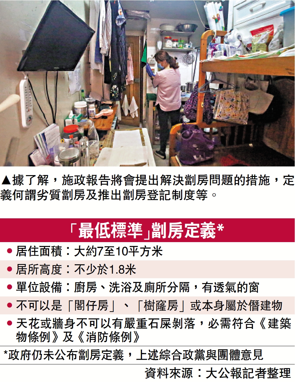 據了解,施政報告將會提出解決劏房問題的措施,定義何謂劣質劏房及推出劏房登記制度,並採取「兩步走」方式,先以行政手段為劏房的面積、登記制度設立標準,未能用行政手段處理的問題,則隨後以立法方式處理。