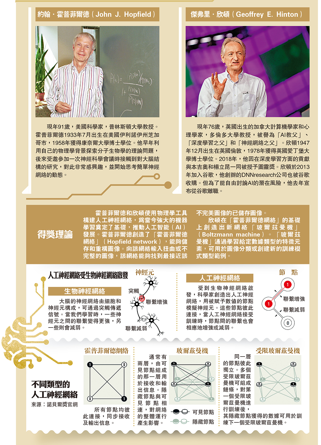 霍普菲爾德和欣頓使用物理學工具構建人工神經網絡,為當今強大的機器學習奠定了基礎,推動人工智能(AI)發展。霍普菲爾德創造了「霍普菲爾德網絡」(Hopfield network),能夠儲存和重構圖像。向該網絡輸入扭曲或不完整的圖像,該網絡能夠找到最接近該不完美圖像的已儲存圖像。