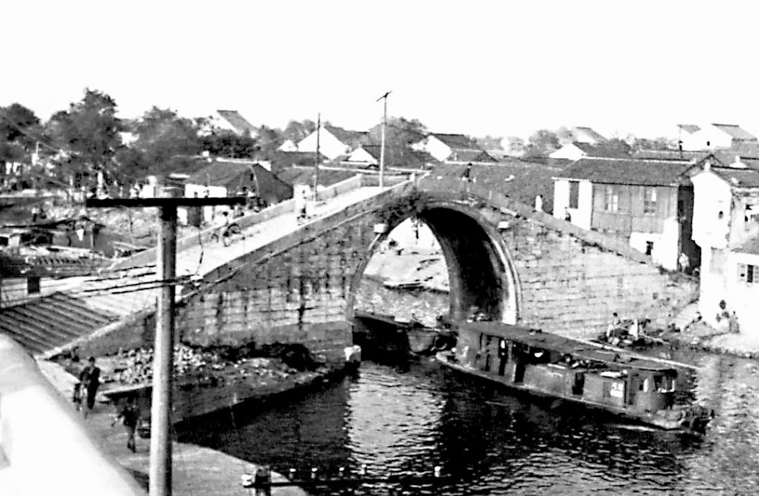 古橋於一九八四年五月拆除,主因是每逢大雨漲水,大船便鑽不過橋洞。新橋水泥造,平坦無拱形,我那日站在新橋上前後左右看,汽車在身後來來往往,南運河仍是浩渺如煙。牛塘鎮政府在中心公園清蓮園內仿建了一座古橋,我們趕時間,沒能去看看。