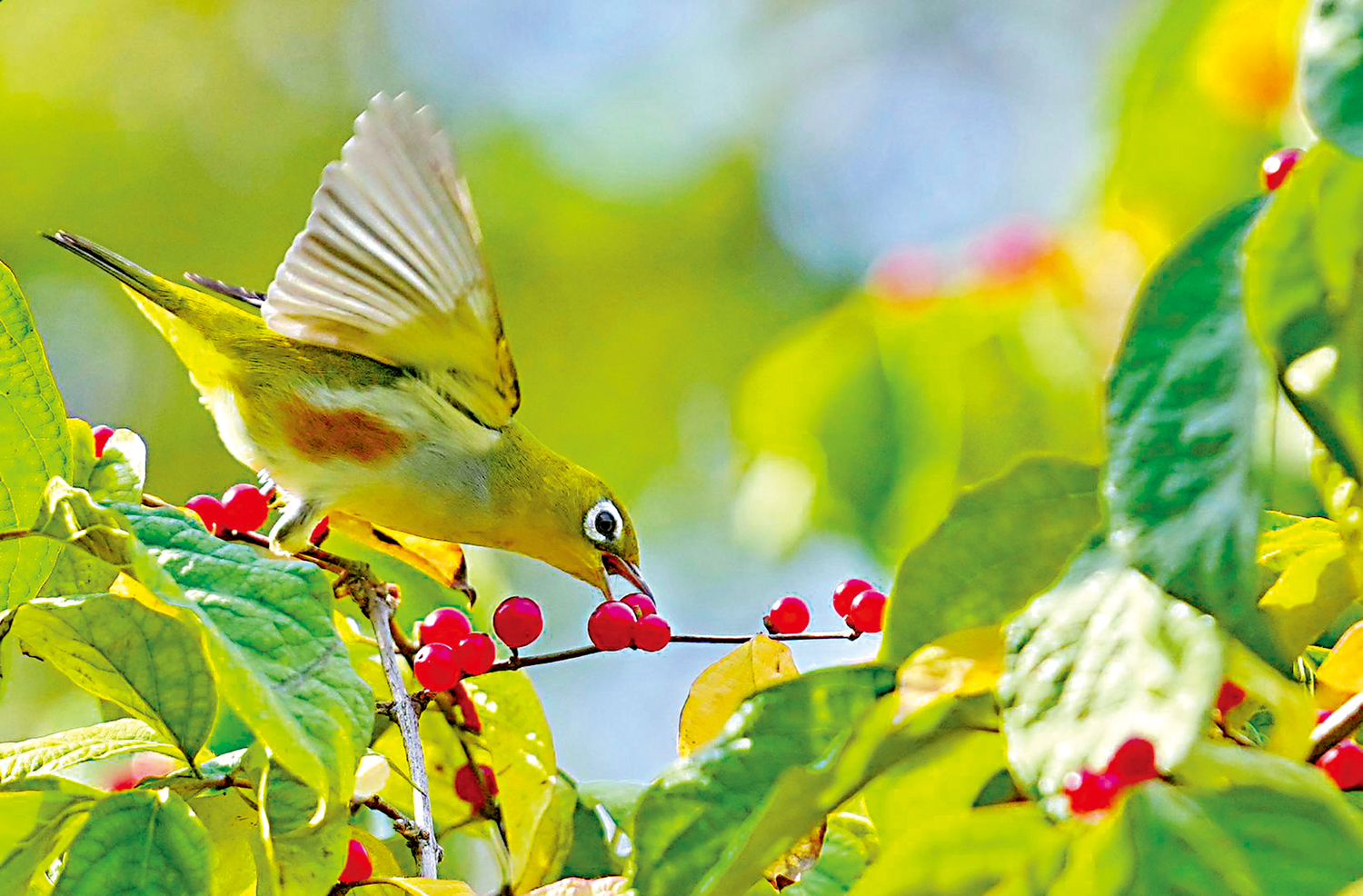 圖:秋日,國家二級保護動物紅脅繡眼鳥在濟南森林公園飛舞穿行,採食漿果,令人賞心悅目。\新華社