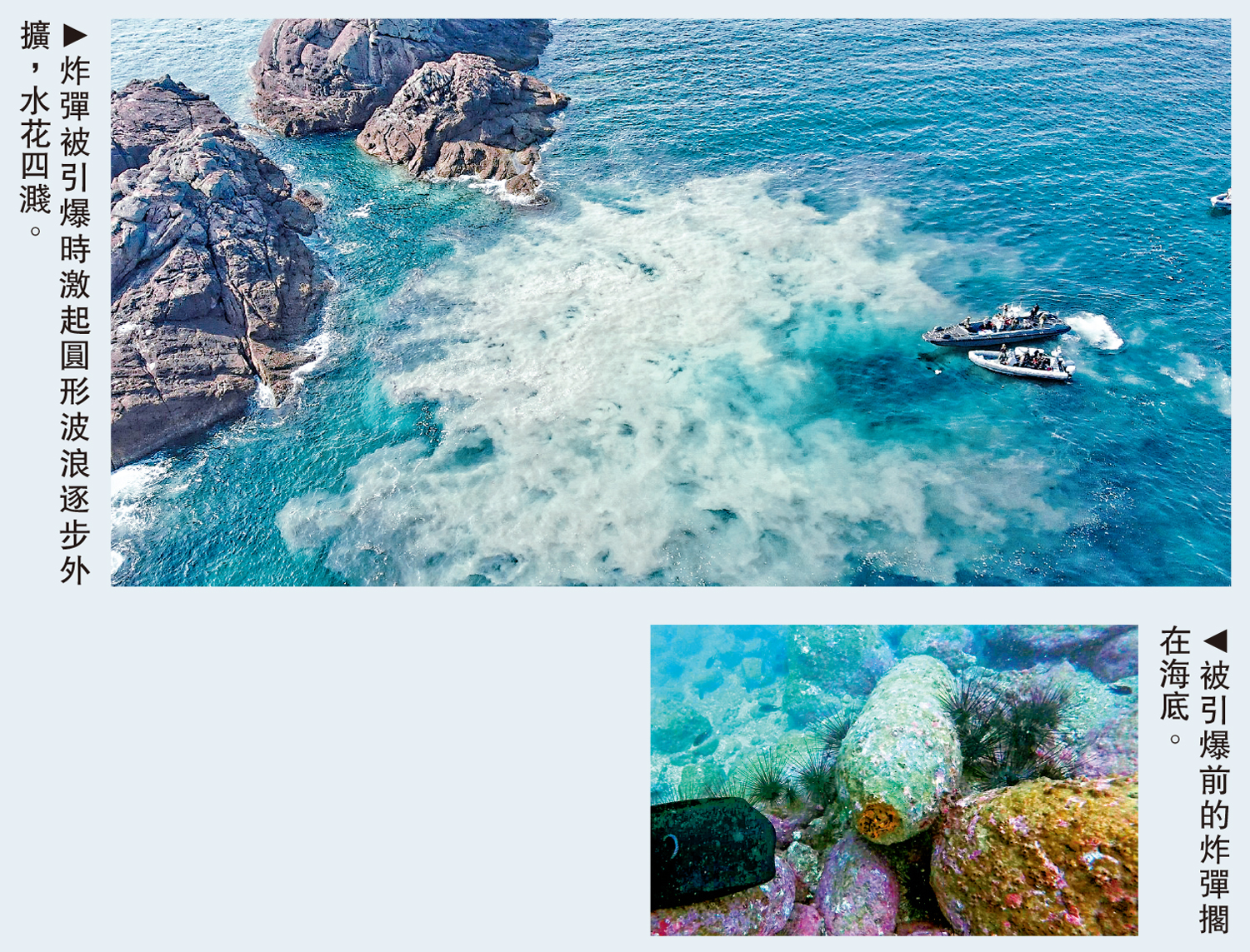 警方照片顯示炸彈威力強勁,引爆時激起圓形波浪逐步外擴,水花四濺,海底沙泥揚起,令海水變得渾濁。警方呼籲,市民如在任何地方發現可疑物品,不要自行處理,應立即通知警方。