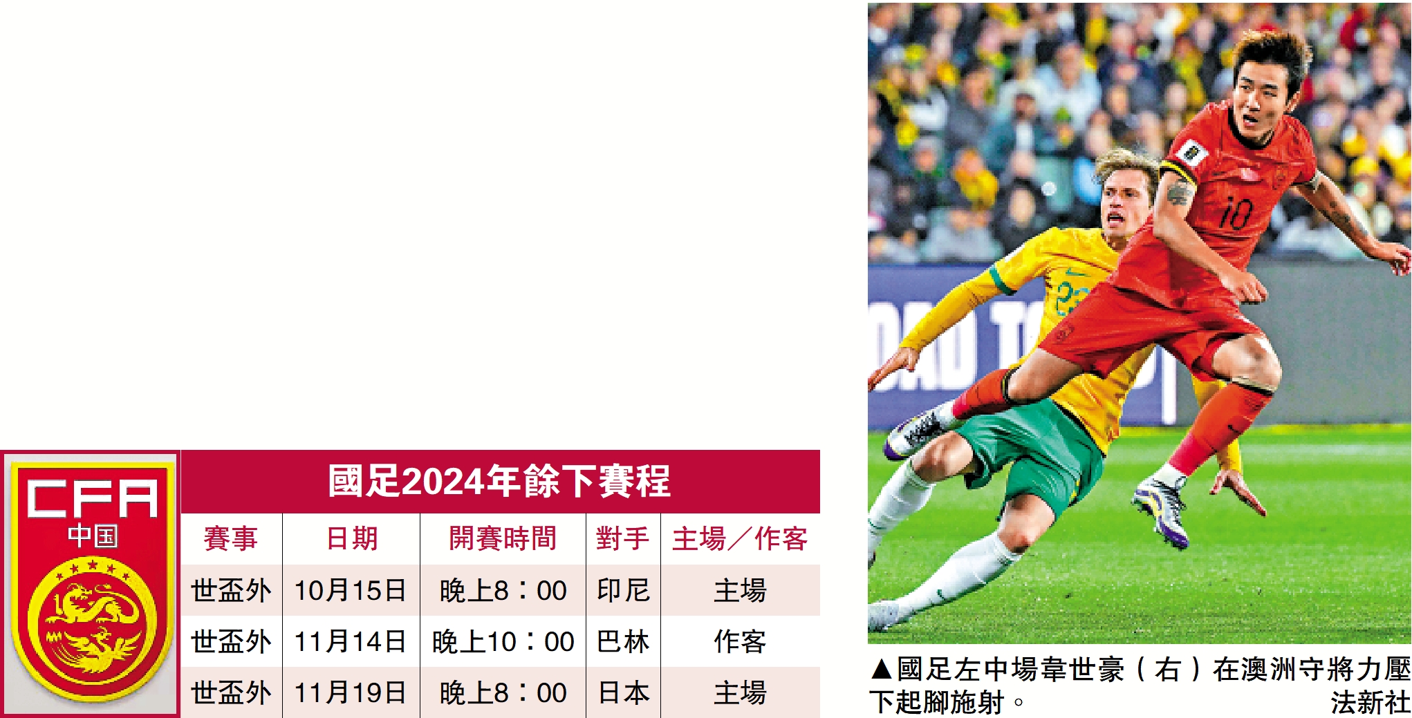 【大公報訊】2026年世界盃外圍賽亞洲區第3階段18強賽C組第3仗昨天舉行,中國男子足球隊作客硬撼澳洲。雖然國足在上半場由謝文能先開紀錄,但澳洲在上半場已經追平比分成1:1。下半場澳洲再下兩城下以3:1反勝。賽後國足3戰全負在C組敬陪末席,澳洲則以1勝1和1負積4分排名第3。