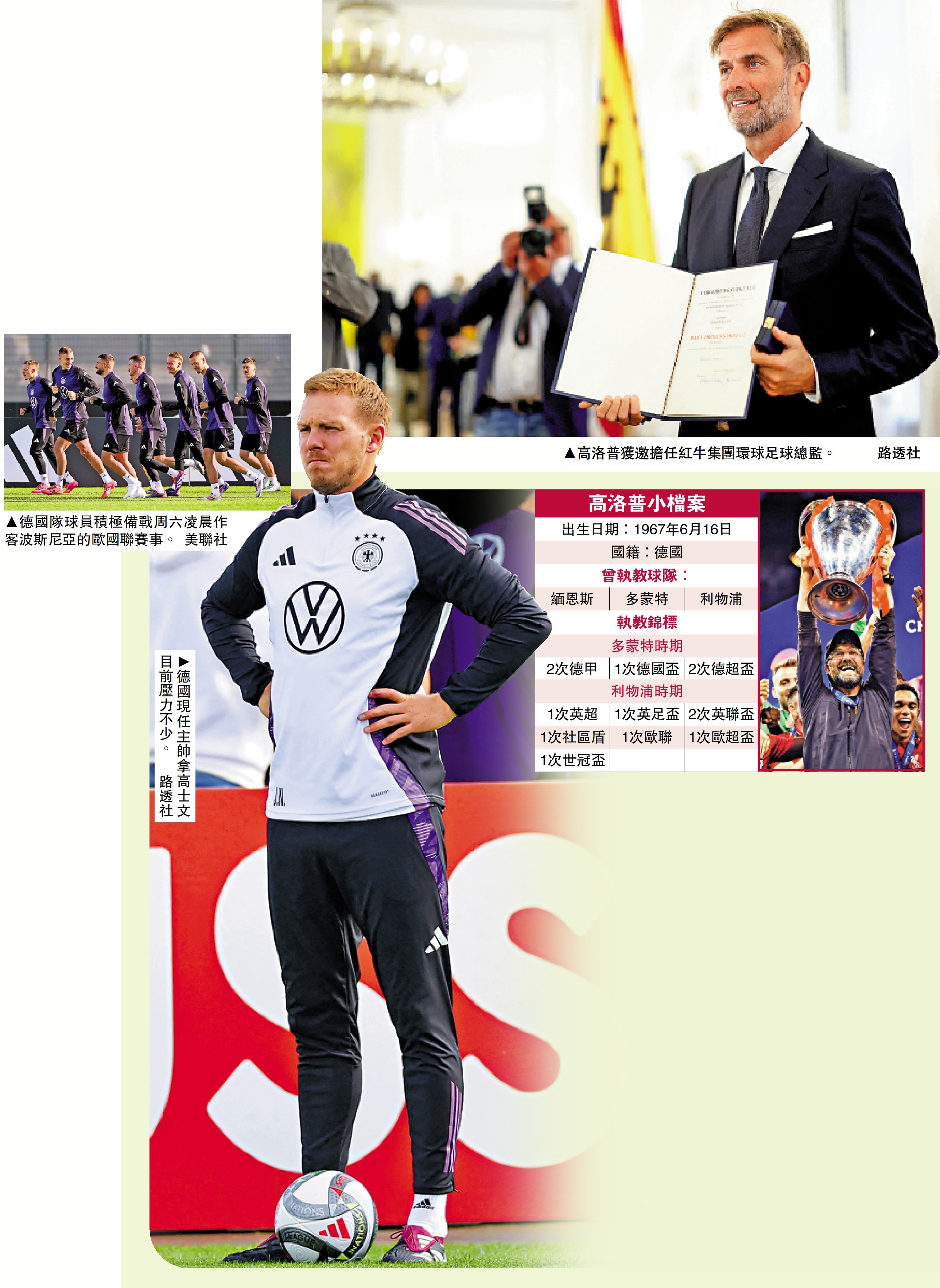 上季季後離任利物浦主帥職位的高洛普近日覓得新工作,將於明年1月1日起擔任紅牛集團的環球足球總監,而值得留意的是集團方面表示,高洛普將不會涉足旗下所有球隊的日常運作以至執教工作。然而,有報道指其合約中包含解約條款,有權隨時離職並重返教練崗位,一般相信是為他未來接掌德國國家隊帥印而「度身訂造」,如今職務被指為「過冷河」,他有可能在2026年世界盃後甚至更早時間,接替現帥拿高士文。\大公報記者 譚德龍