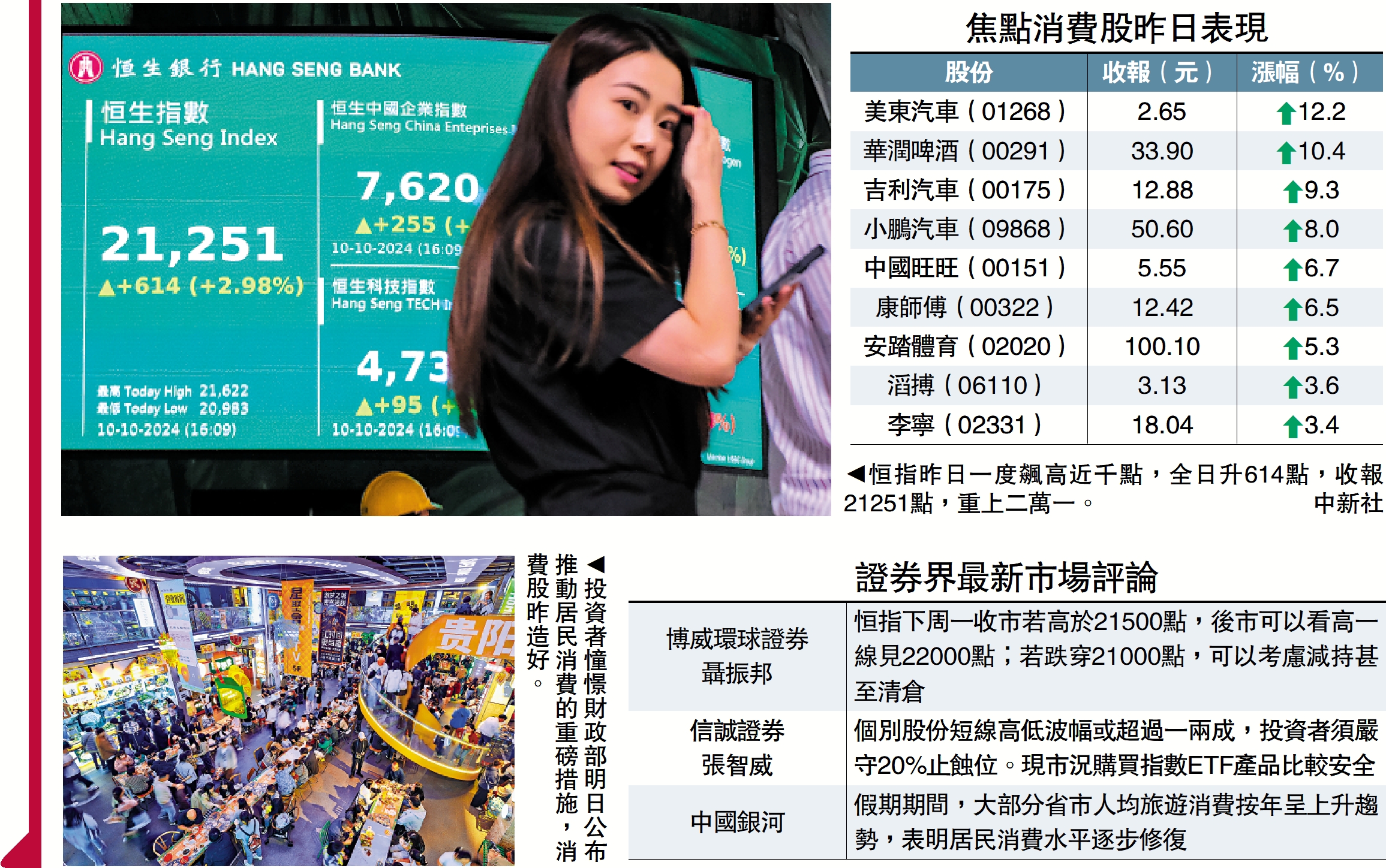 人民銀行開始接受首期5000億規模證券、基金、保險互換便利(SFISF)申請,提振投資者入市信心,恒指昨日一度飆高近千點,全日升614點,收報21251點,重上二萬一。投資者憧憬國家財政部明日公布推動居民消費的重磅措施,消費股造好,華潤啤酒(00291)股價升10.4%,是升幅最大藍籌。