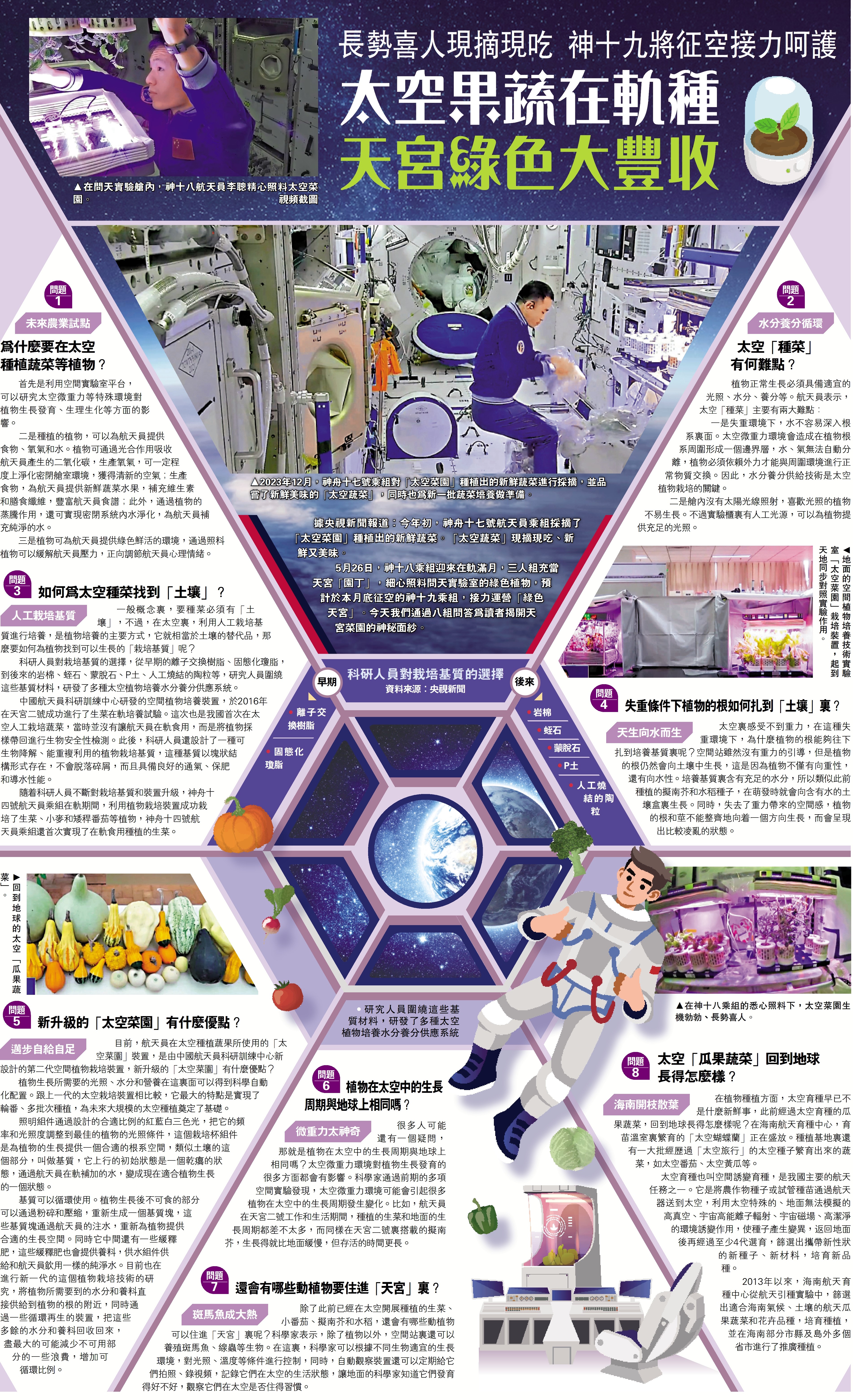 5月26日,神十八乘組迎來在軌滿月,三人組充當天宮「園丁」,細心照料問天實驗室的綠色植物,預計於本月底征空的神十九乘組,接力運營「綠色天宮」。今天我們通過八組問答為讀者揭開天宮菜園的神秘面紗。