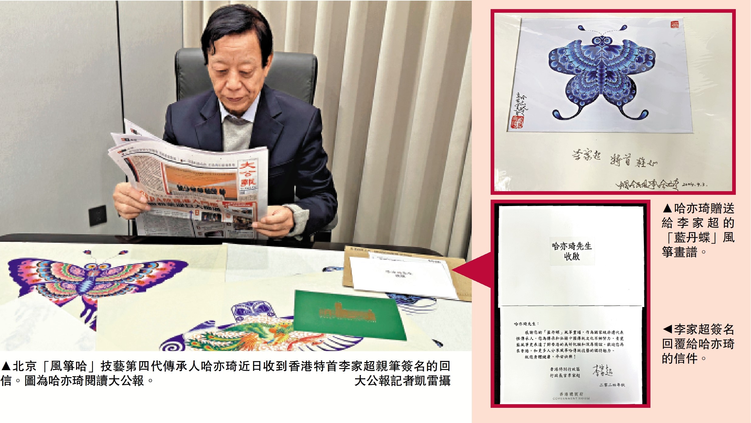 9月底,香港特別行政區行政長官李家超率近三百人赴京出席第27屆京港洽談會。洽談會期間,國家非物質文化遺產、風箏製作技藝「風箏哈」第四代傳承人哈亦琦修書一封,希望將他親手繪製的非遺作品「藍丹蝶」風箏畫譜贈予特首,象徵「由治及興」的香港政通人和,表達對香港的美好祝願。最終,這份彌足珍貴的心意由與會的大公文匯傳媒集團北京新聞中心記者代為轉交特首辦。國慶節長假剛過,哈亦琦收到李家超親筆簽名的回信。回信中,李家超讚揚他作為國家級非遺代表性傳承人,為傳承和弘揚中國傳統文化不懈努力,歡迎哈亦琦先生再來香港,和更多人分享「風箏哈」傳統技藝的獨特魅力。\大公報記者 李暢、羅洪嘯、凱雷北京報道