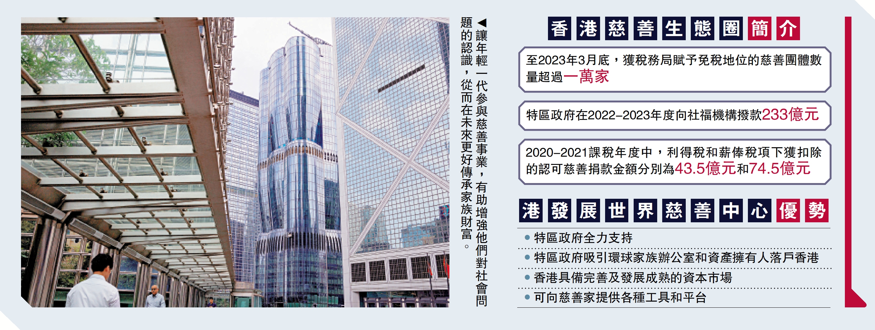 香港過去熱心舉辦眾多慈善活動。特區政府在去年3月公布的《有關香港發展家族辦公室業務的政策宣言》中提到,發展香港成為慈善中心,措施中包括優化申請成為獲豁免繳稅的慈善團體的程序,以及優化立法建議,提高獲豁免慈善團體可在家族投資控權工具享有實益權益的程度。從而為全球家族辦公室和慈善家調配慈善資金。