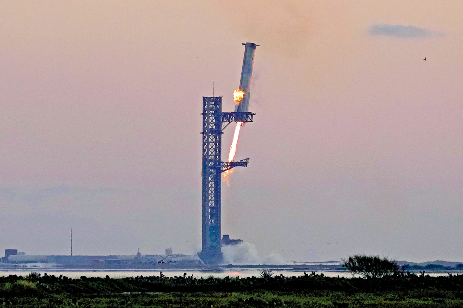 【大公報訊】據法新社報道:美國太空探索技術公司(SpaceX)新一代重型運載火箭「星艦」13日發射升空,這是「星艦」第五次試飛。升空約7分鐘後,SpaceX按預定計劃用發射塔的機械臂「筷子」「夾住」返回地球的「超級重型」助推器。