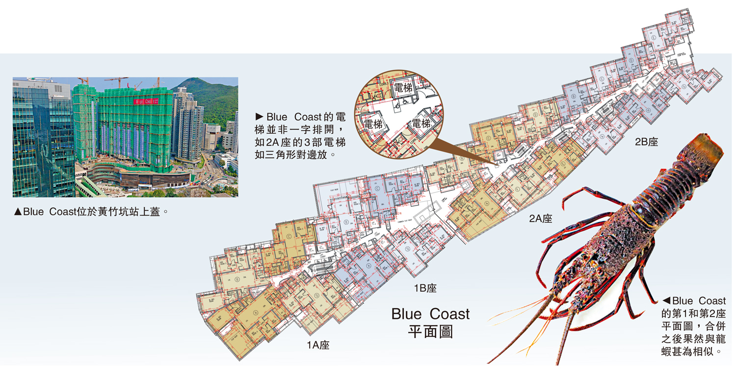 長實(01113)為本港主要發展商之一,每年推售多個樓盤,部分戶型設計甚為獨特,叫買家及業界嘖嘖稱奇。其中,今年4月開賣的黃竹坑站上蓋Blue Coast,由於單位排序一節節,從高空俯瞰,外形猶如一隻栩栩如生的龍蝦,故被地產界網紅笑稱為「龍蝦則」。