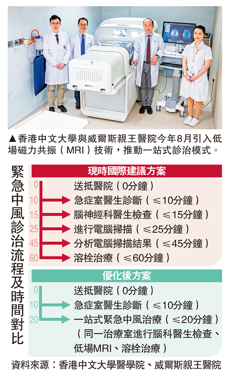 中國卒中學會今年牽頭應用0.23T低場MRI技術,並與首都醫科大學附屬北京天壇醫院開展「一站式緊急中風診治」(ESU)模式在全國多中心的臨床研究項目,中大和威院成為研究項目試點。在ESU模式下,急性中風的臨床評估、影像檢查和治療,集中在配備低場MRI的同一間治療室內,由入院到治療,整體時間可縮至20分鐘內。