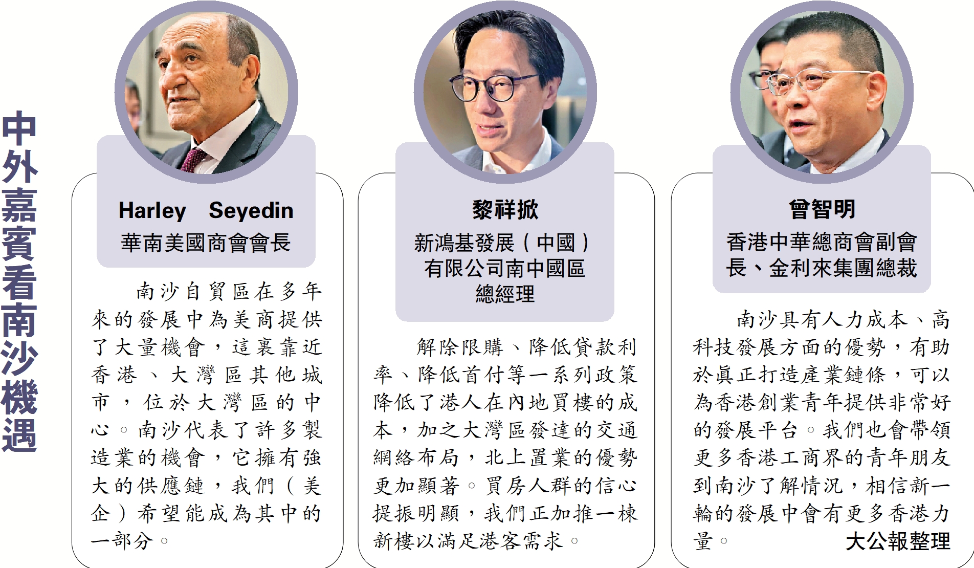 南沙自貿區在多年來的發展中為美商提供了大量機會,這裏靠近香港、大灣區其他城市,位於大灣區的中心。南沙代表了許多製造業的機會,它擁有強大的供應鏈,我們(美企)希望能成為其中的一部分。