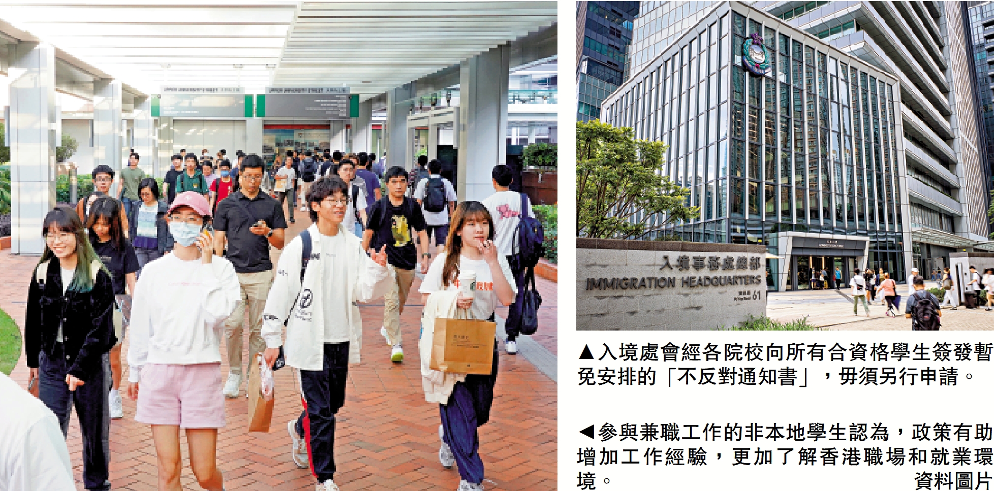 以往根據《入境規例》,以學生身份來港的人士,不得接受有薪或無薪的僱傭工作。早年放寬安排,非本地學生事先取得入境處處長的許可,可從事實習工作和兼職工作,但有一定限制。為增加在港留學生學習及增值機會,全日制非本地研究生從事兼職工作的限制,自去年11月起暫免執行,在獲得入境處發出「不反對通知書」後,可從事兼職工作,工作時數及地點不受限制。
