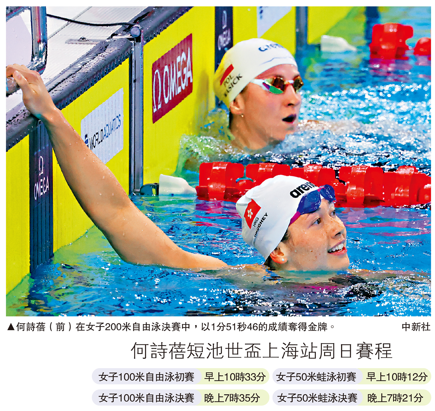 世界泳聯短池游泳世界盃上海站於昨日進行第2個比賽日,中國香港「女飛魚」何詩蓓於昨早出戰女子200米自由泳初賽後順利晉級決賽,最終游出1分51秒46成績,以接近2秒差距拋離亞軍泳手勝出。何詩蓓在上屆世界盃連續3站橫掃100米及200米金牌,力爭衛冕6冠已是先過首關。她將於今日繼續出戰女子100米自由泳賽事及50米蛙泳,繼續向冠軍進發。\大公報記者 夏微、朱家立報道
