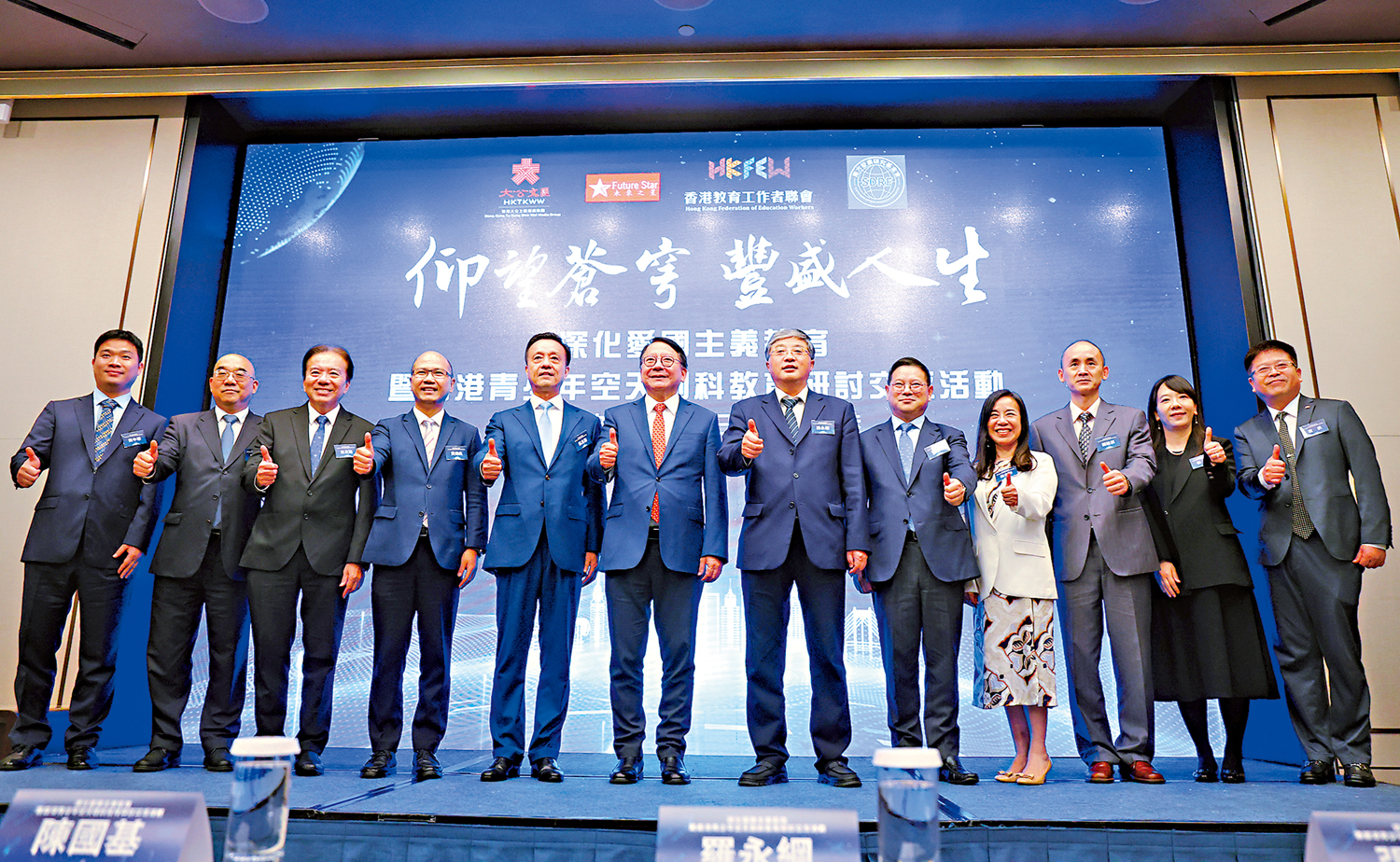 為提升香港青少年對國家空天事業的了解和熱愛,強化當代青少年的愛國主義情懷,香港大公文匯傳媒集團與香港教育工作者聯會、南方發展研究基金會、未來之星同學會昨日聯合舉辦「仰望蒼穹 豐盛人生『深化愛國主義教育暨香港青少年空天創科教育研討交流活動』」,吸引香港青少年學生和教育工作者、文化界和傳媒界代表等逾百人參與。特區政府政務司司長陳國基,中央政府駐港聯絡辦副主任羅永綱,香港大公文匯傳媒集團副董事長兼總編輯張國義,全國人大代表、香港教育工作者聯會主席黃錦良,全國政協常委、南方發展研究基金會理事會會長姚志勝等出席活動。