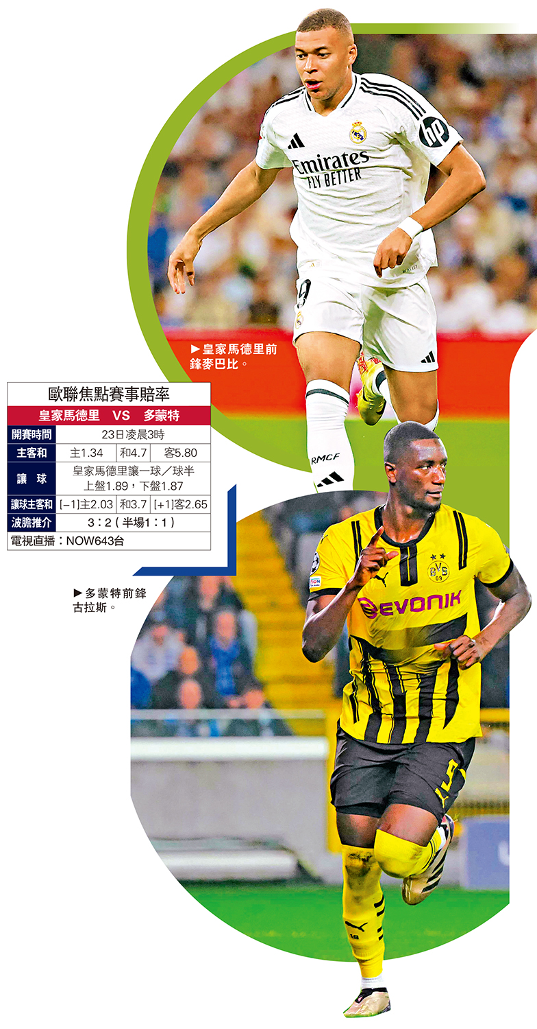 上屆歐聯決賽、西甲「銀河艦隊」皇家馬德里在倫敦溫布萊球場對陣德甲「大黃蜂」多蒙特的戲碼,明晨會在前者的班拿貝球場重演。與該場決賽相比,今次雙方最重點的變化就在前鋒人物之上,皇馬正式由基利安麥巴比擔綱前鋒,而多蒙特亦換上了上季德甲次席射手古拉斯領銜攻堅,而兩人至今亦交出亮麗的成績表,在聯賽和歐聯取得不少入球,亦不約而同在剛過去的聯賽有「士哥」,且看兩支「新鋒貌」球隊今次交手,戰況會有何不同。\大公報記者 譚德龍