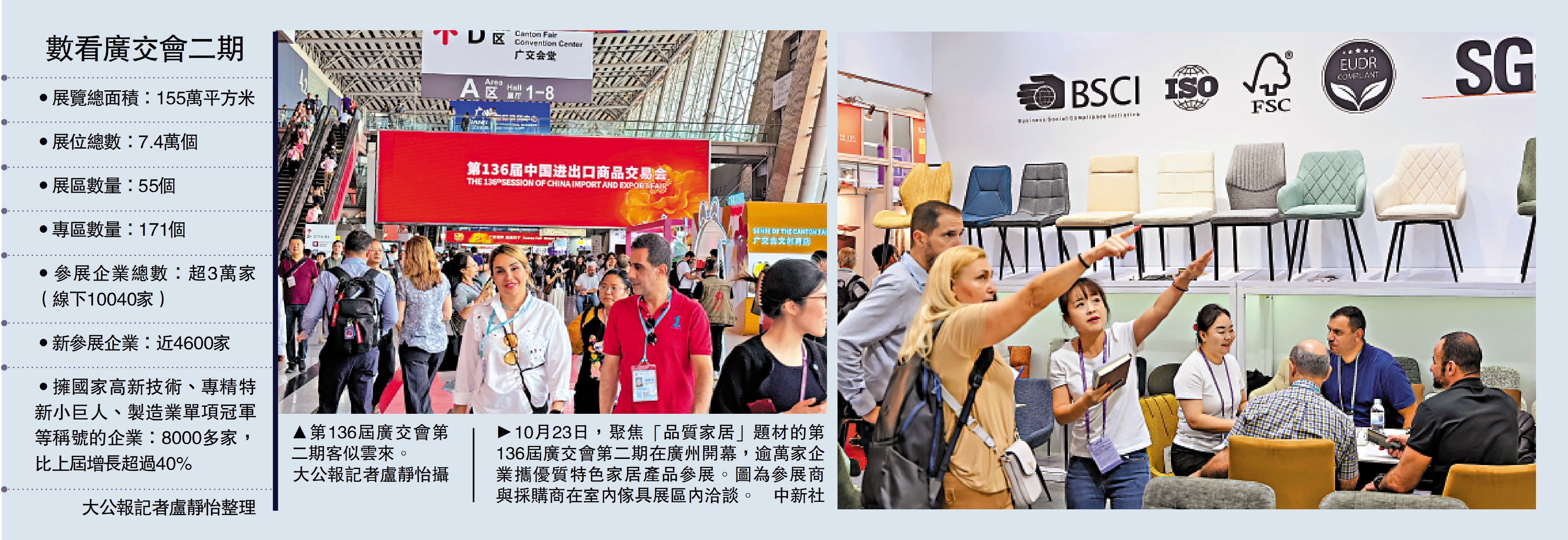 聚焦「品質家居」題材的第136屆廣交會二期23日在廣州開幕。本期展覽總面積51.5萬平方米,展位數量24700餘個,參展企業10040家,包括家庭用品、禮品及裝飾品、建材及傢具3個板塊15個展區,展出的綠色低碳產品逾104萬件,較上屆增長130%。