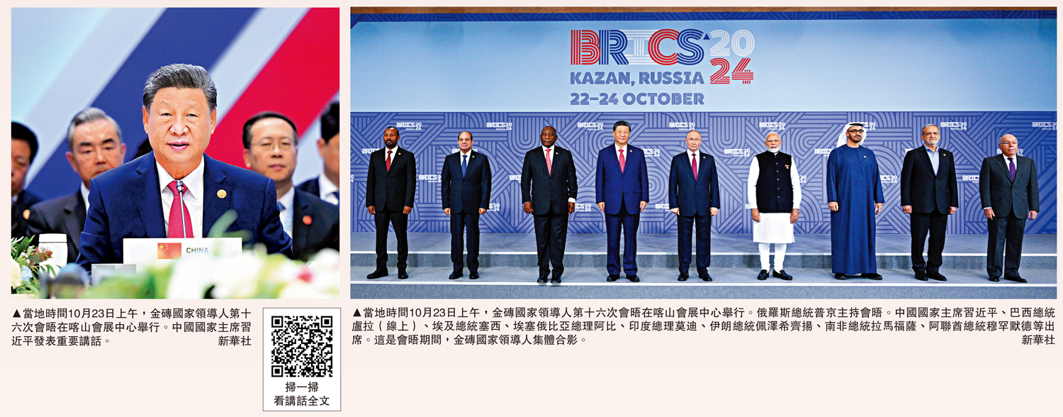 習近平強調,世界越是動盪,我們越要高舉和平、發展、合作、共贏旗幟,淬煉金磚成色,展現金磚力量。要發出和平之聲,倡導對話而不對抗、結伴而不結盟的新型安全。要共謀發展之路,倡導普惠包容的經濟多極化,堅守共同發展的大道。要夯實合作之基,深化農業、能源、礦產、經貿等傳統領域合作,拓展綠色低碳、人工智能等新興領域合作,維護貿易投資和金融安全。