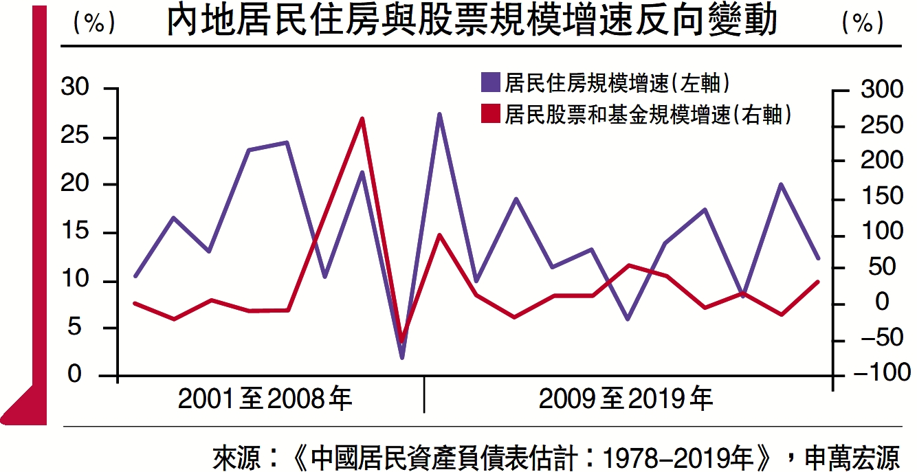 居民資產中,住房佔比較高影響財富基礎,金融資產波動較大影響財富彈性。從資產存量看,2019年,居民總資產中住房佔比高達64.7%,對居民財富基礎影響較為顯著。邊際上看,股票等金融資產佔比僅為5.6%,但2001年來規模同比的標準差高達68.9%,較大的波動幅度對財富彈性影響也較為明顯。特別是,市場持股收益出現負增長時,會直接拖累居民財富;近些年股票資產規模縮減最大為2018年、達3萬億元人民幣。