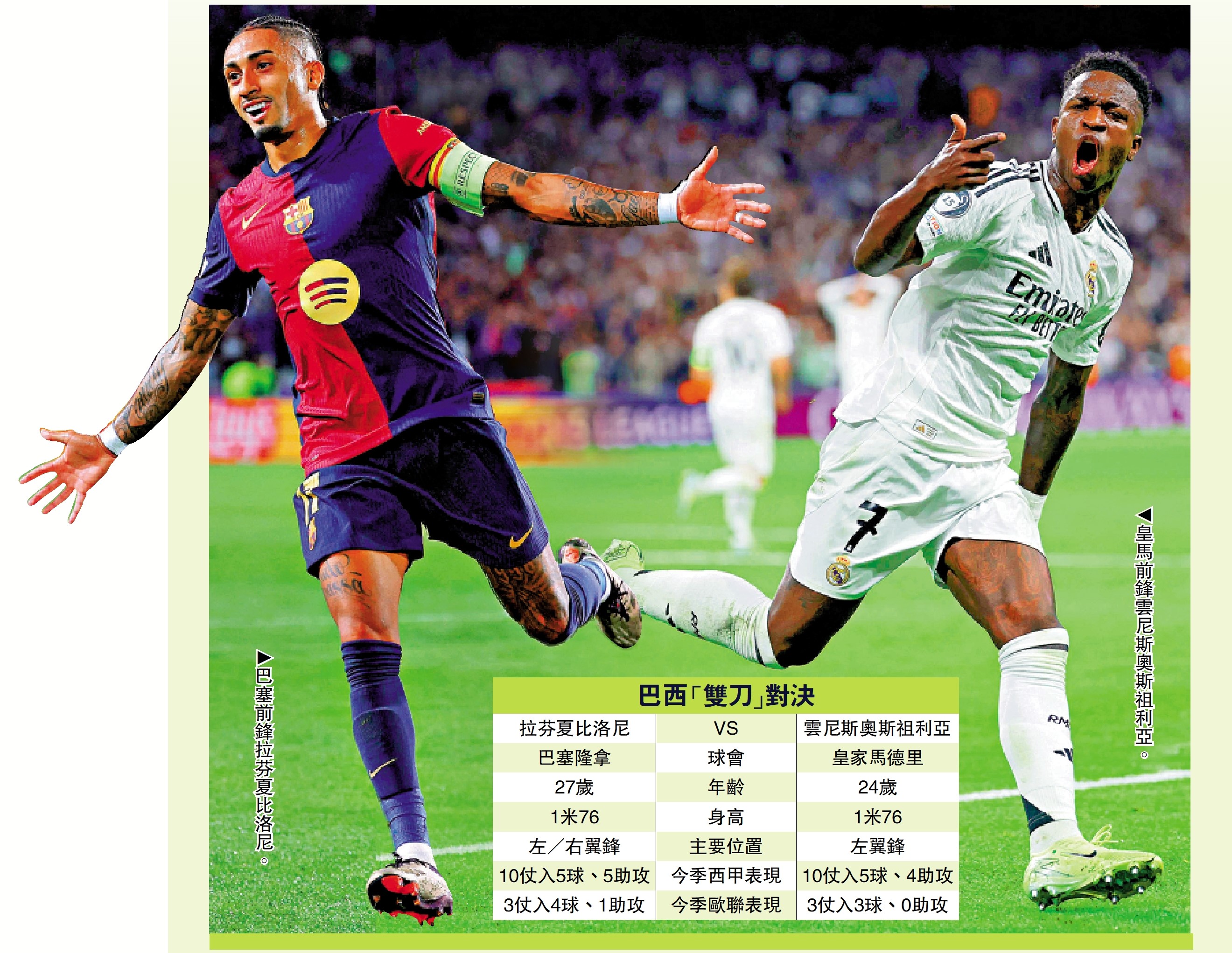 分別在西甲效力皇家馬德里和巴塞隆拿兩大班霸的巴西國腳翼鋒、雲尼斯奧斯祖利亞與拉芬夏比洛尼,開季同樣有突出表現。雲尼斯奧斯雖然被新加盟的基利安麥巴比搶去不少風頭,但進攻表現仍然一貫的銳利;拉芬夏就獲新主帥費力克安排於前線作不同嘗試,近仗擔任進攻中場更有神來之筆的演出,更在前3名隊長人選皆受傷下戴上隊長臂章。明晨兩人就在西甲首循環「國家打吡」各為其主,彼此貢獻的入球或助攻,隨時是勝負關鍵。\大公報記者 譚德龍