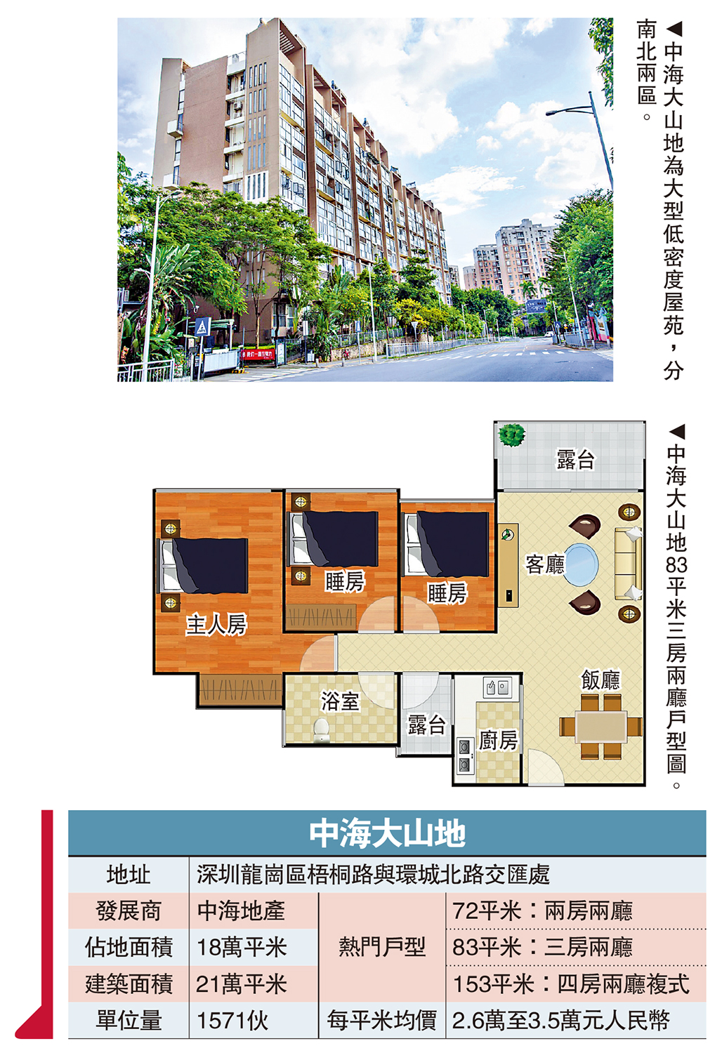 中海大山地位於橫崗街道梧桐路與環城北路交匯處,佔地18萬平米,建築面積21萬平米,為大型低密度屋苑,分南北兩區,共計1571伙。戶型多元化,包括雙拼別墅、聯排別墅、山地疊加別墅和多層住宅等,戶型有72至86平米兩房、83至105平米三房、98至171平米四房等,滿足不同業主的居住需求。
