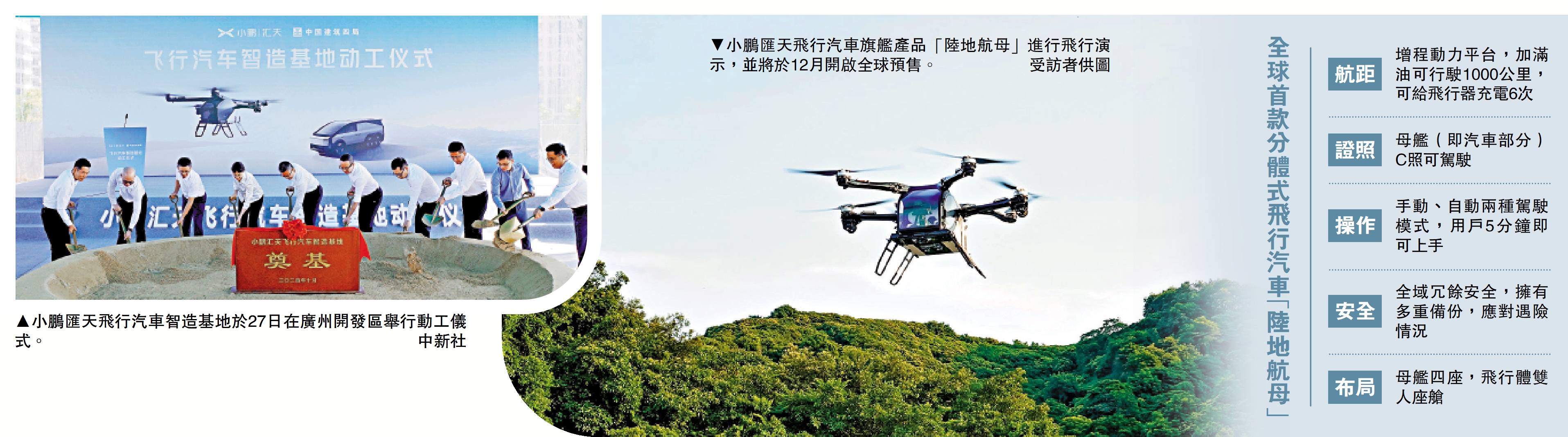 經多年自主研發,小鵬匯天開發出全球首個車載自動分合機構,一鍵操作便可實現陸行體和飛行體的自動分離、結合。去年10月,其分體式飛行汽車「陸地航母」首次公開亮相,今年9月,該航空器首次在廣州亮相並公開試飛並展示應用場景。