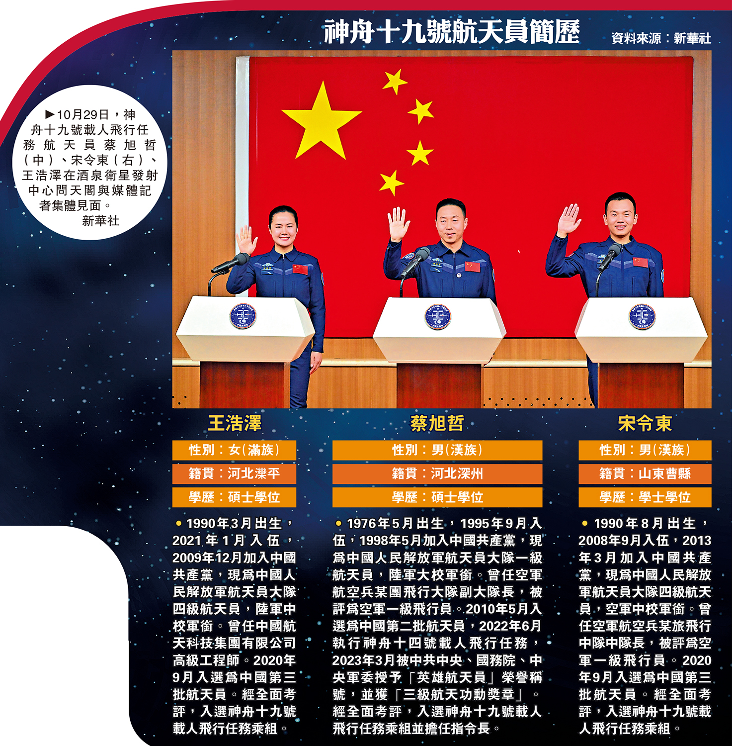 中國神舟十九號載人飛船瞄準北京時間10月30日4時27分發射升空。30日中午時分,天宮空間站即將迎來神舟十九號航天員乘組,其中指令長蔡旭哲是第二次飛赴空間站,兩名90後航天員中宋令東入選前是空軍飛行員,王浩澤入選前是來自於航天科技集團的火箭專家,她也將成為中國首位女性航天飛行工程師、中國第三位執行載人航天飛行任務的女性。而「太空出差」已滿半年的神舟十八號乘組,也會與「神十九」的戰友們,於中國空間站再度上演「太空會師」。\大公報記者 劉凝哲
