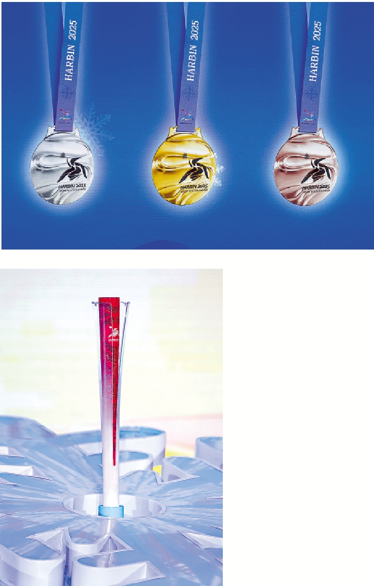 亞冬會獎牌「競速精神」同日發布。獎牌正面融合賽道流線和亞冬會會徽,以動態衝擊力凝煉出運動健兒馳騁賽場的矯健身姿,展現出競技體育的力與美;賽道的曲線造型融入哈爾濱大劇院的形象,具有獨特的城市美學特徵。獎牌背面以亞布力雪上賽區的山巒與樹林景色,結合大小興安嶺的地形地貌繪就地域特色的山水畫卷,展現了黑龍江大地的美麗富饒。