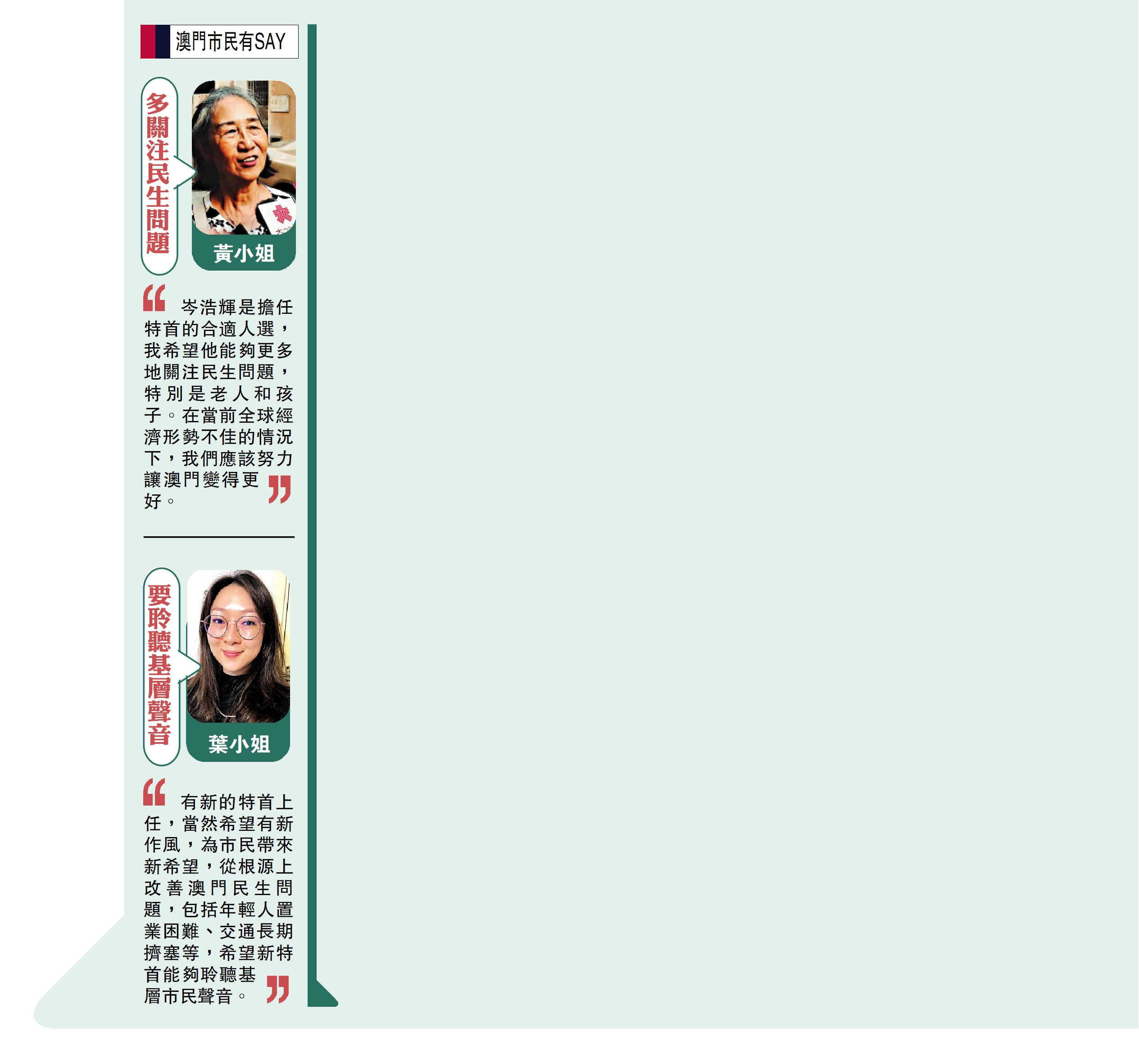 有新的特首上任,當然希望有新作風,為市民帶來新希望,從根源上改善澳門民生問題,包括年輕人置業困難、交通長期擠塞等,希望新特首能夠聆聽基層市民聲音。