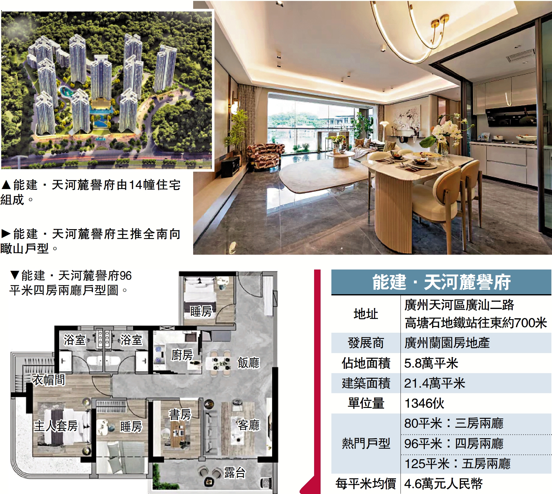 位於廣州天河區廣汕二路的能建·天河麓譽府,共14幢住宅,包括10幢高層及4幢多層,共1346伙。項目距離地鐵6號線高塘石站約900米,1公里內有8個公交站,對外交通便捷。自駕方面,項目北邊是快速路廣汕二路,500米處是廣連高速,可接駁廣佛肇高速和廣州環城高速。