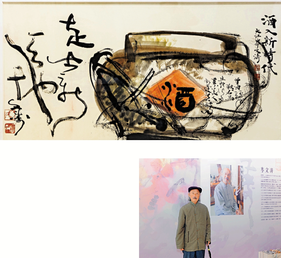 漫步展廳,人們首先就會被一幅幅氣勢磅礴的大作所震撼。比如在《松風萬里》圖中,岑文濤以狂草之筆勢入畫,在他的筆下,古樹蒼勁有力,松枝桀驁不拘,再配以藝術家所填的《沁園春·詠松》:「看龍鱗鐵甲,一身傲骨,千般氣節,萬古豪雄……」讓人感受到一股撲面而來的豪邁之氣。岑文濤畫風多元,除了狂放大氣的書畫作品,展覽現場還有許多別具趣味的小品佳作。比如在兩幅畫扇作品中,岑文濤用精緻細膩的筆觸,獨具匠心的命意,將傲骨英風的梅花、淤而不染的蓮花,活靈活現地重現於精巧的扇面之上。在展覽現場,一些以「酒」為主題的作品也吸引了很多參觀者駐足。在一幅名為《太白詩意》的作品中,一尊碩大無朋的酒壺居於畫面中央,當中一個「酒」字,兩邊輔以清潔的菊花,讓人不禁聯想起詩仙李白的詩酒人生。本次展覽由香江國際集團主辦。揭幕現場,展覽策劃人、香江國際集團董事長楊孫西博士表示,香港作為東西方文化交匯的中心和中轉站,擁有獨特的文化豐富性與多樣性。岑文濤先生就是香港文化綠洲中的一棵大樹。他師古不泥古,師法自然實即心從造化,他的畫品、書品與人品實為一體,力求完美。