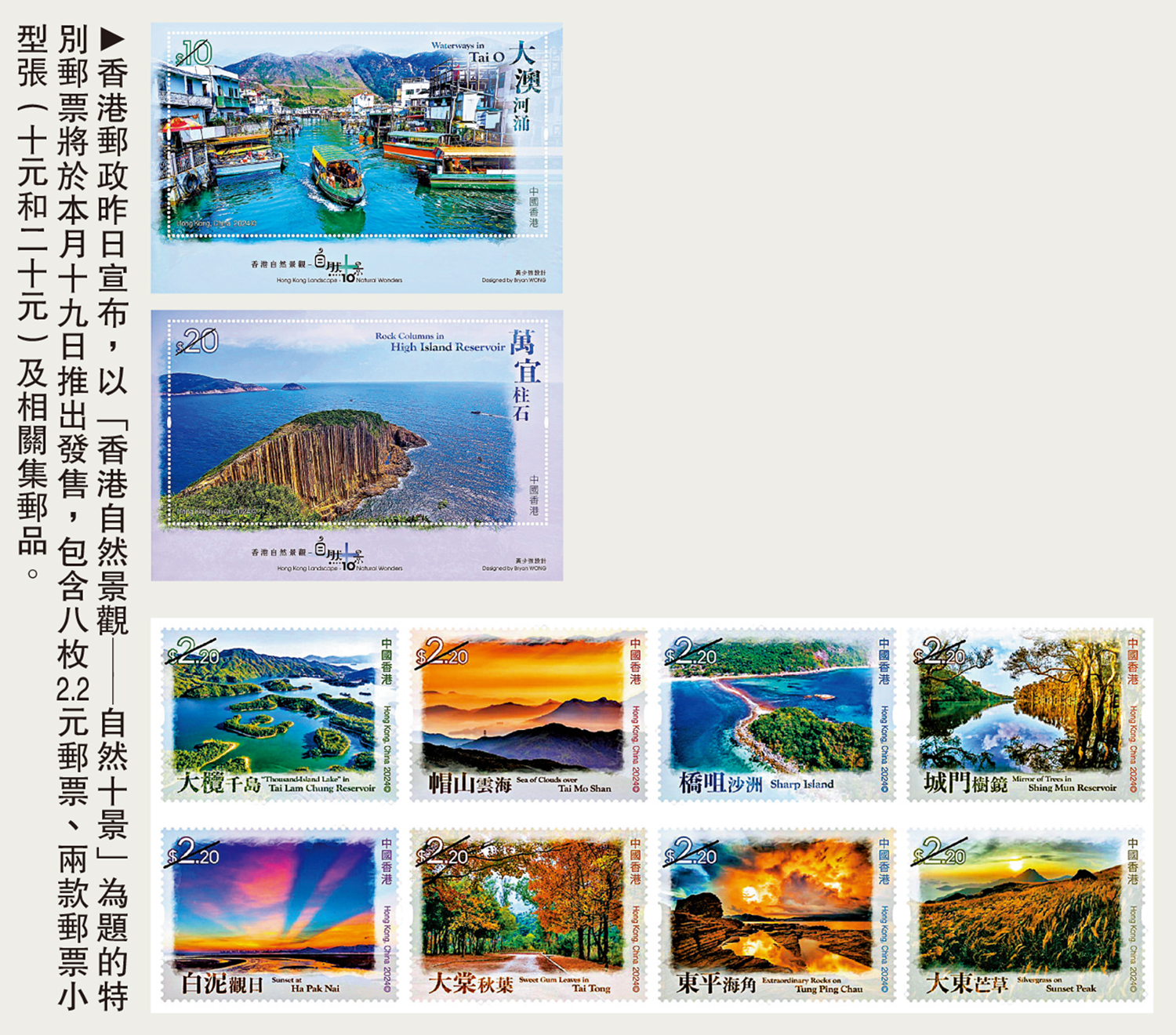 各位集郵迷有福啦!香港郵政昨日宣布,以「香港自然景觀──自然十景」為題的特別郵票將於11月19日推出發售,包含一套八枚郵票、兩款郵票小型張及相關集郵品。
