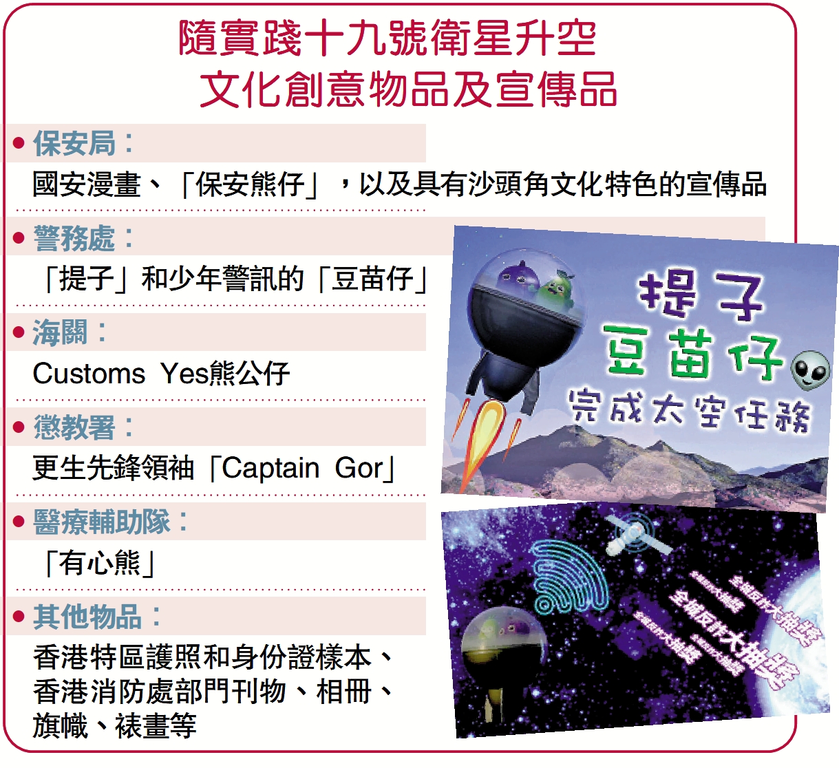 「實踐十九號衛星」於9月27日發射升空,10月11日成功返航。參與今次載荷的文創物品及宣傳品包括國安漫畫,作為漫畫主角之一的「保安熊仔」亦特製裝備遠赴太空,讓小朋友了解國家安全的重要性,局方亦挑選了具沙頭角文化特色的宣傳品上太空。多支部隊的吉祥物亦有參與載荷,如警務處的「提子」和少訊的「豆苗仔」、海關Customs Yes熊公仔、醫療輔助隊「有心熊」等等。
