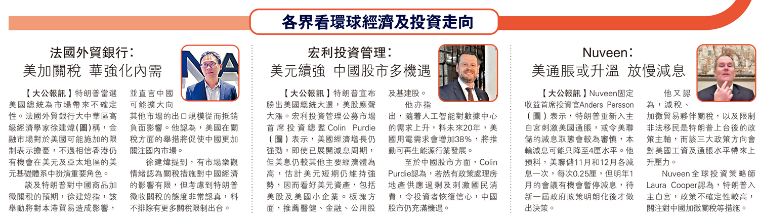 他又認為,減稅、加徵貿易夥伴關稅,以及限制非法移民是特朗普上台後的政策主軸,而該三大政策方向會對美國工資及通脹水平帶來上升壓力。