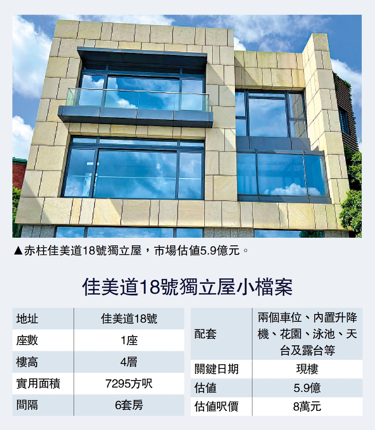 該獨立屋早於2020年落成,2022年放售叫價6.3億元,惟隨着市況回軟,參照最新成交價,市值約5.9億元,呎價約8萬元水平,賬面仍較購入價3170萬元大升17倍。
