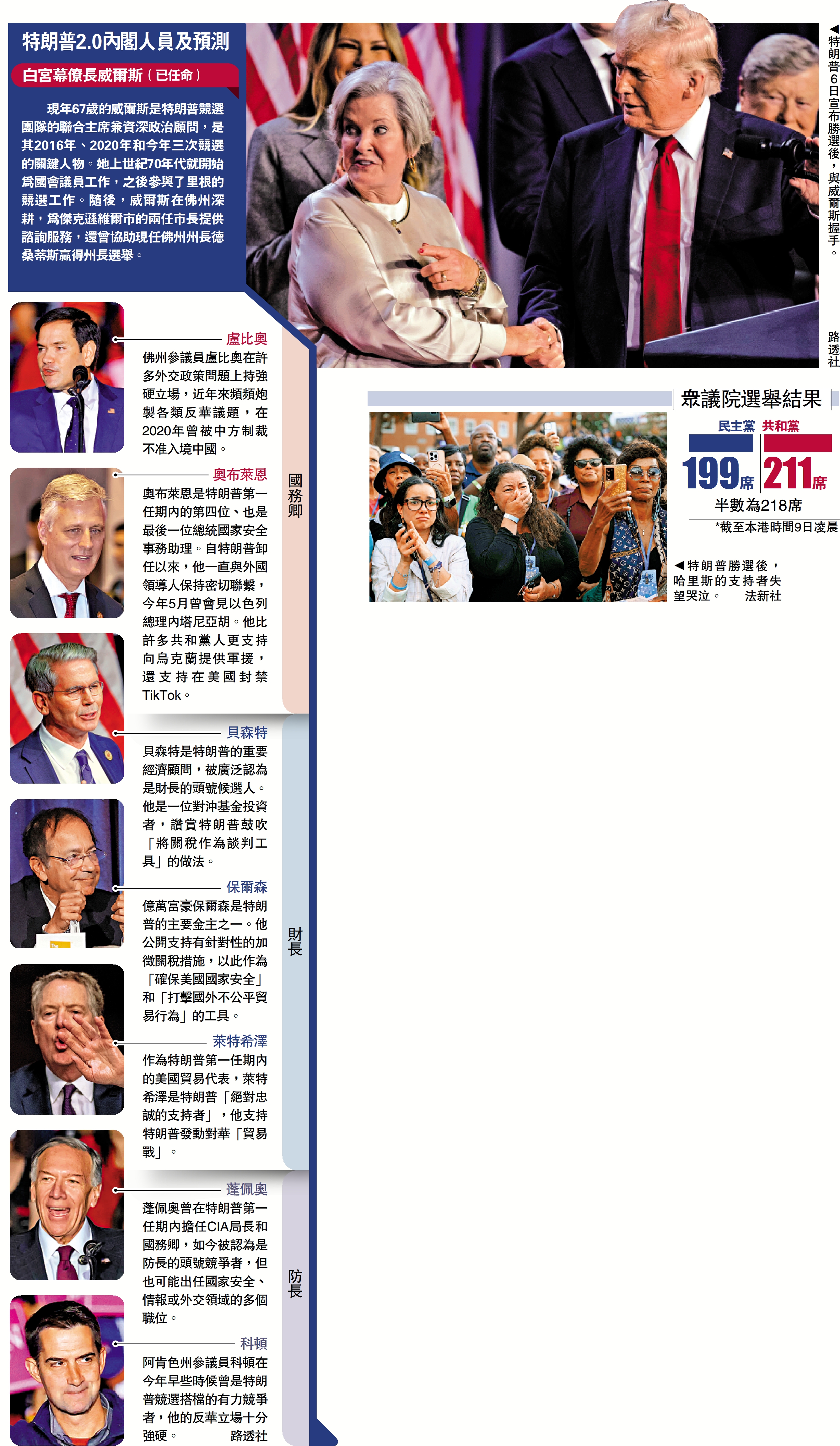 在國務卿人選方面,佛州參議員盧比奧、前美國駐德國大使格雷內爾和前國家安全事務助理奧布萊恩被認為是熱門人選。盧比奧一向被視為對華鷹派,奧布萊恩曾擔任特朗普首個任期的國家安全事務助理,格雷內爾則被視為是特朗普外交政策的忠實執行者。
