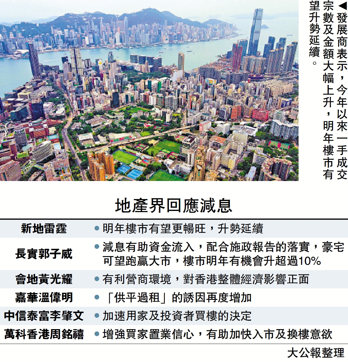 【大公報訊】美國聯儲局再減息0.25厘,本港個別銀行相繼跟隨調低最優惠利率,進一步減輕供樓負擔。發展商認為,息口呈下行趨勢,刺激資金流向樓市,進一步擴闊「供平過租」格局,將會加快市民入市決定,預料明年樓市更暢旺,延續升勢。
