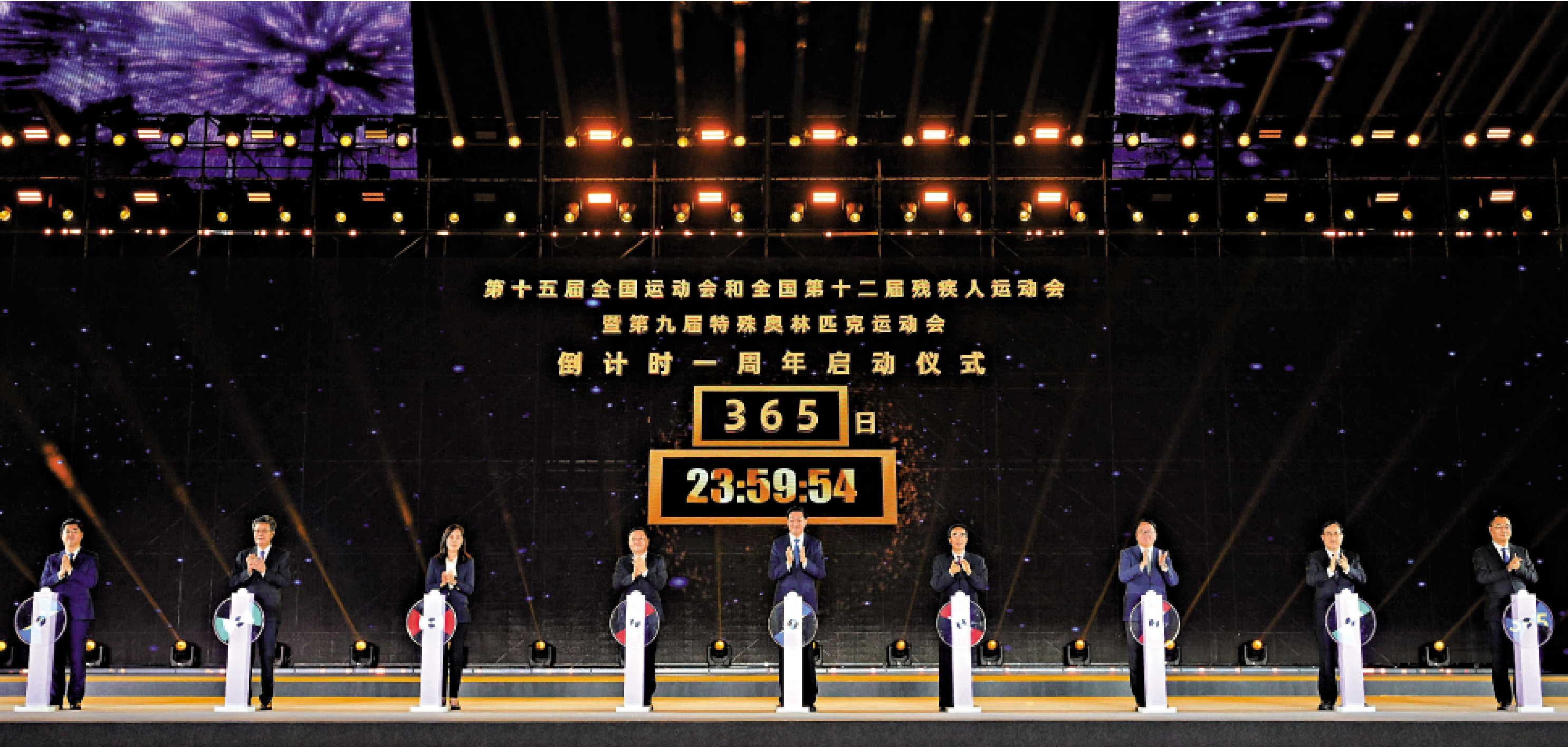 十五運組委會主任、國家體育總局局長高志丹,殘特奧會組委會主任、中國殘聯主席程凱,十五運會組委會執行主任、廣東省省長王偉中,香港賽區籌委會主席、特區政府政務司司長陳國基,澳門特區政府社會文化司司長、全運會澳門賽區組委會主席歐陽瑜等出席活動,十五運組委會執行主任、香港特區行政長官李家超,十五運組委會執行主任、澳門特區行政長官賀一誠發表視頻致辭。