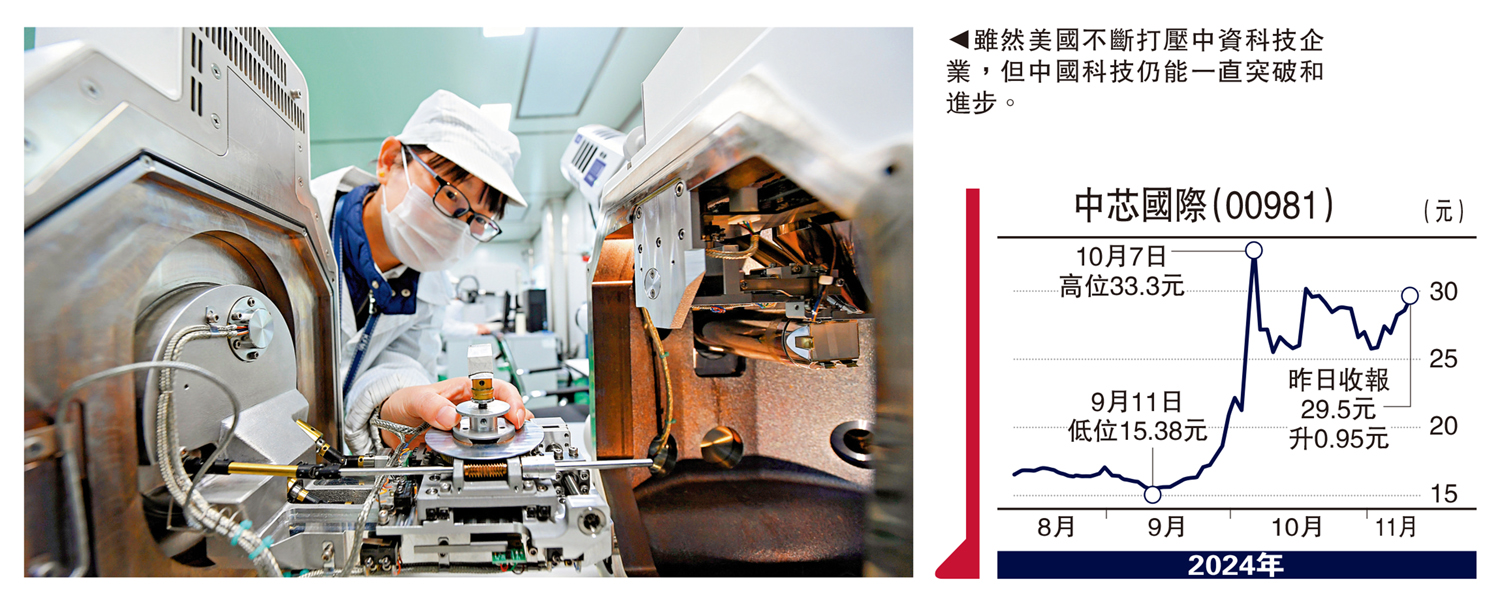 值得留意的是,美國不斷阻撓中國科技發展,暴露出美國對自身科技實力的信心不足,特別是科技發展退步,以至被超前的恐懼日益加劇。不過,中國科技自立勢頭強勁,無懼美國技術封鎖,中國愈是受到打壓,科技愈是突飛猛進。中資科技股如中芯國際、小米集團、中興通訊昨日在恒指下跌逾300點的市況中逆市上升,反映資金持續押注看好中國科技發展,支持恒生科技指數年內上升逾20%,成為今年表現出眾指數之一,這與中國創新科技、產業技術攻關取得成果有密切關係。近期有關內地半導體產業在生產先進芯片領域上大突破的消息不脛而走,例如華為集團將推出的Mate 70新手機,可能搭載自家研發生產5納米芯片。