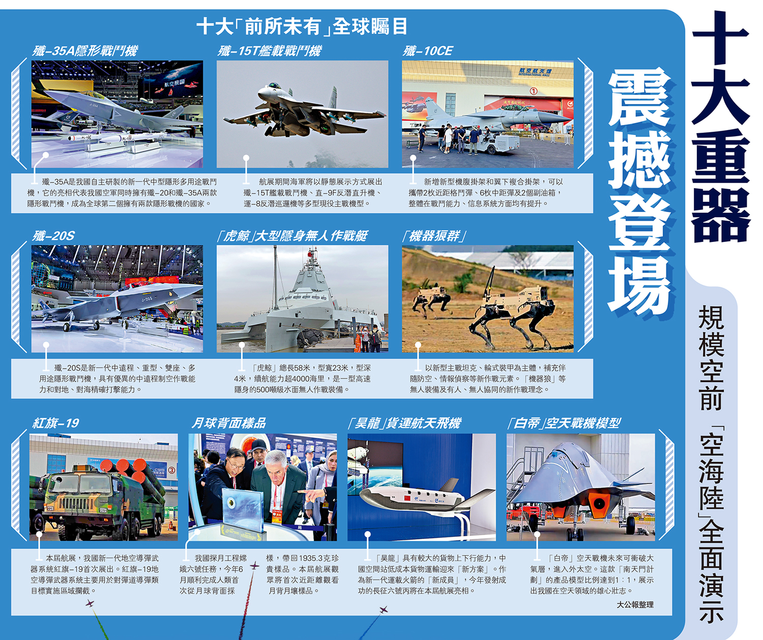 本屆航展規模空前,展館面積和展品數量創歷史新高,首次打造「空、海、陸」一體的動態演示新格局。十大「前所未有」震撼亮相,盡顯逐夢長空的中國力量。
