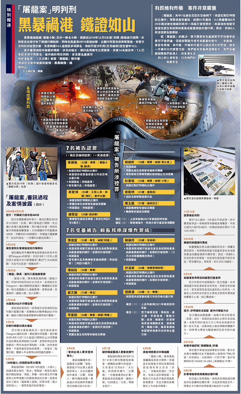案件審理過程中披露的情節、涉及的槍支、爆炸品等都令公眾震驚。涉案14名被告中,7人已承認多項不同罪名,案件將於明日判刑,涉及罪名最高可判終身監禁。《大公報》彙整「屠龍案」部分審理過程及當中披露的案情,黑暴禍港,鐵證如山!\大公報記者 陳樂