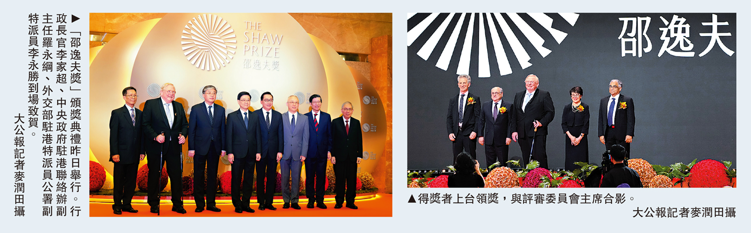 2024年度「邵逸夫獎」頒獎典禮昨日在香港會議展覽中心大會堂舉行。今年共有五名科學家獲得獎項,包括四位2024年度的得獎者以及一位2021年度得獎者斯科特·埃姆爾教授。四位2024年度得獎者分別獲天文學獎、生命科學與醫學獎、數學科學獎3個獎項,每項獎金為120萬美元。