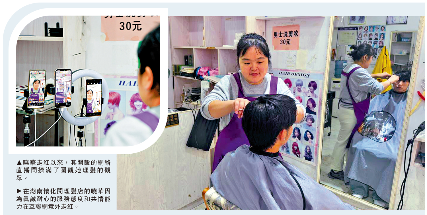 剪帥帥的頭髮,遊美美的懷化。近日,湖南懷化一名原本默默無聞的髮型師曉華,因為真誠耐心的服務態度、親民的定價以及「聽得懂顧客講話」的共情能力,意外在短視頻平台走紅,更僅憑她的一間小店、一把剪刀,將湖南省懷化市鶴城區城南街道長泥坡新村變成了網紅打卡地。當地相關部門緊抓機遇,沿街推出特產小攤、特色表演等不少文旅節目以促消費。
