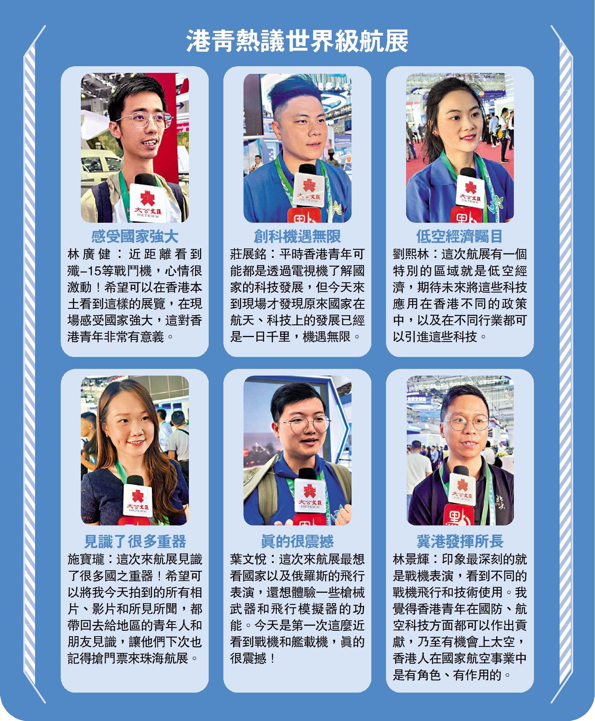林景輝:印象最深刻的就是戰機表演,看到不同的戰機飛行和技術使用。我覺得香港青年在國防、航空科技方面都可以作出貢獻,乃至有機會上太空,香港人在國家航空事業中是有角色、有作用的。